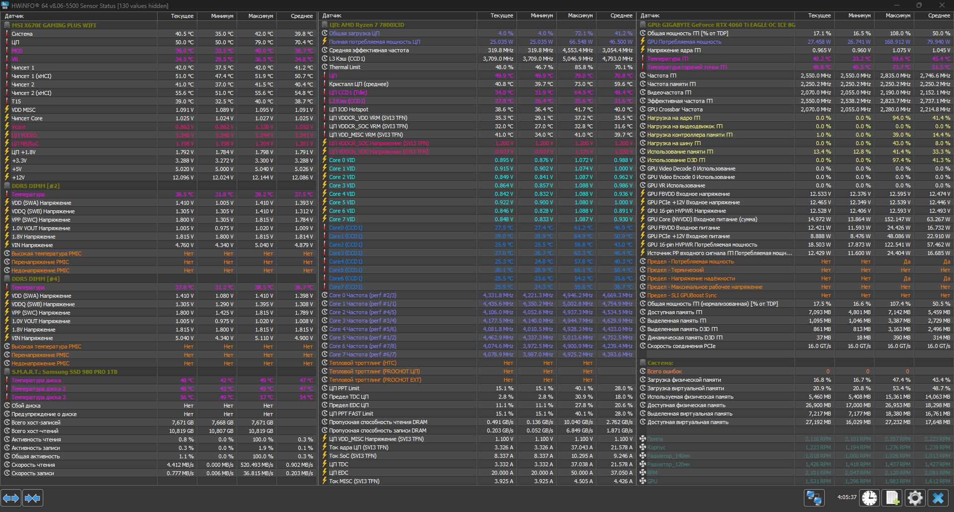 Не соглашусь) Отличная видеокарта. Спек 7800x3d, 32гб, мать msi x670e и данная карточка. Играю в сетевые(cs, pubg, apex legend) на 240гц мониторе FHD и это не с шакальной графикой. Всегда пашет под 100% и справляется. Стабильный фпс, не шумная, холодная, инпутлаг приемлемый. Приложил скрин после 4-ёх часов в апекс(сбрасывал мониторинг хв инфо перед стартом). Обороты вертушек можно увидеть в колоне справа внизу(GPU). Температуры и прочее тоже справа.