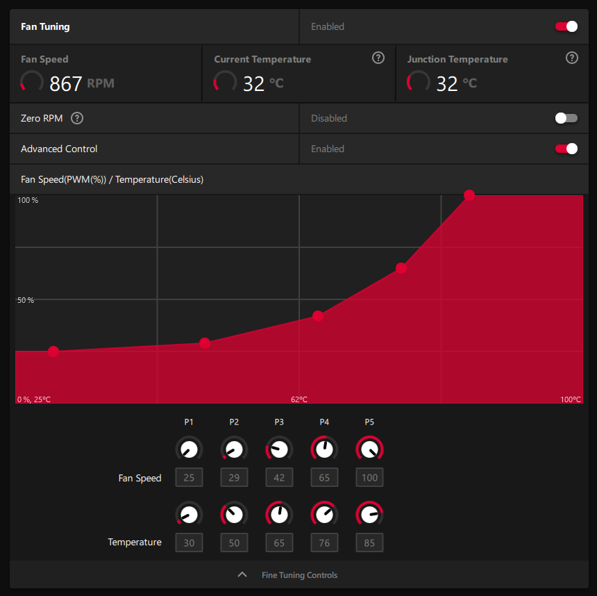 Хм, у меня андервольт более эффективно получилось именно в Wattman, а в МРТ либо ниже производительность, либо крашится драйвер, я имею введу при подборе напряжения. Да и в Wattman вот и кривая оборотов, настроил как надо и все, как я понял при такой настройке без разницы какая target температура. Ну и я ZeroRPM не использую, сделал меньше минимальный PWM так чтобы были минимально возможные обороты и вентиляторов вообще не слышно, а вот этот старт/стоп туда-сюда мне не нравится. А на счет напряжения, в МРТ как то оно криво работает, ставишь одно, получается значительно меньше.