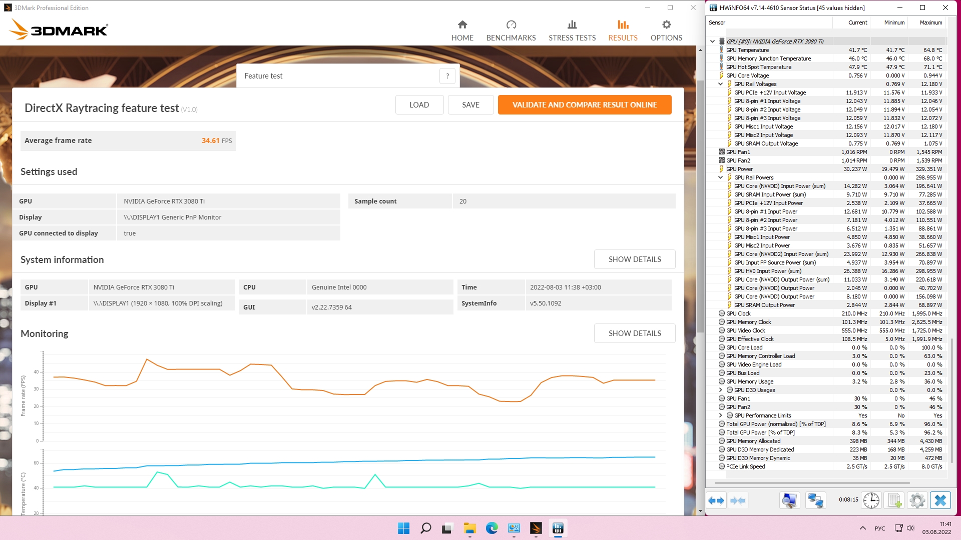 эт да, а DirectX Raytracing feature test (V1.0) из 3DMark'a - вообще туши свет на воздухе 414(весь лимит выжирает) и 109 хотспот ну и вылетает, кто на воде может поэкспериментить с концом упора 3080ti даж в лимит 350 вписалась(при 1995@0.943v), а Port Roal'e уже нет(скидывала частоты)