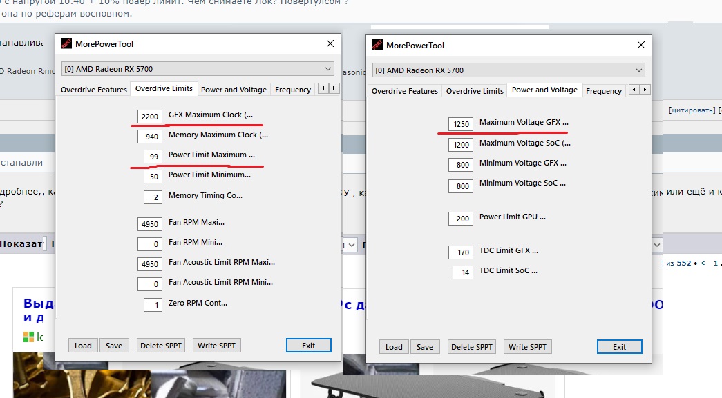 Частоты и напряжение подбираешь сам, например не трогаешь напряжение и поднимаешь частоту пока не начнутся проблемы (мерцаня, артефакты, зависания и прочая бесовщина), это не страшно, по крайней мере прям сразу видюха от этого точно не откинется. Как начались проблемы добавляешь напряжение, миливольт 50, тестируешь, если все ок, поднимаешь частоту и так по кругу, во всем этом деле главное за температурами следить, мой психологический барьер был 95 по хотспоту, по заявлению АМД предел 105, это именно хотспот (hotspot), он же temperature junction. Соответственно, если растут температуры поднимаешь обороты вентилятора, чтобы охладить видеокарту. Так и ищещь пределы - частоты, температуры, шума, думаешь надо оно тебе или нет... В павертулсе поднимаем максимальную частоту, паверлимит и максимальное напряжение