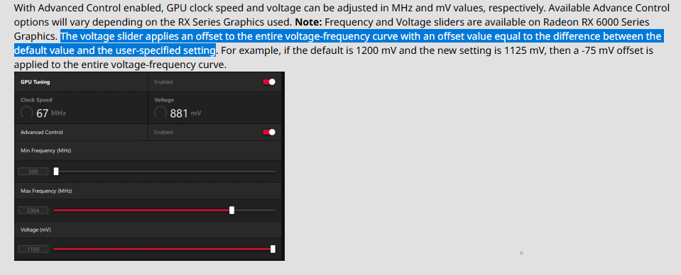 Просто самого термин "undervolt" применительно к rdna ничего не несет, кроме путаницы. AVFS в принципе исключает ручной контроль напряжения. Если мы под "undervolt" понимаем снижение энергопотребления при незначительном падении производительности, то тогда этих трех ползунков достаточно, - без ручного контроля напряжения. (имхо, единственный способ сделать "undervolt" - это записать в конфиг PWM-ки для GFX и SOC отриц. офсеты, может в MPT есть, точно не скажу)