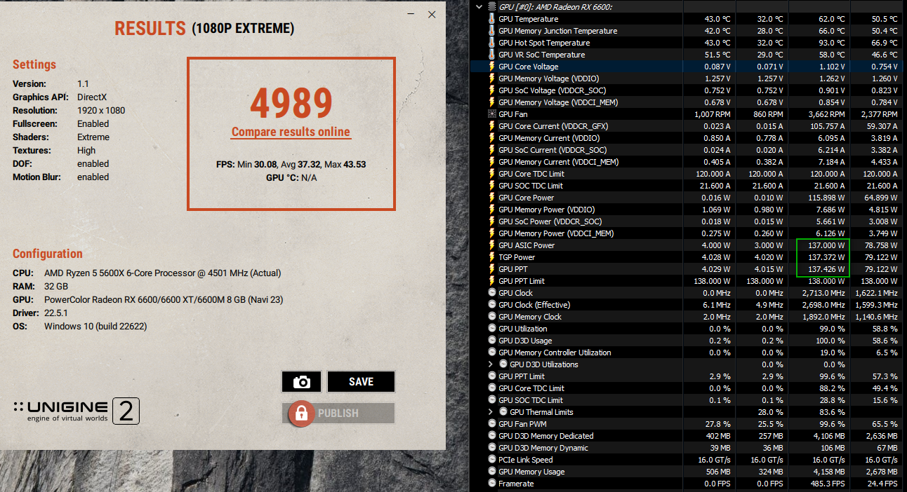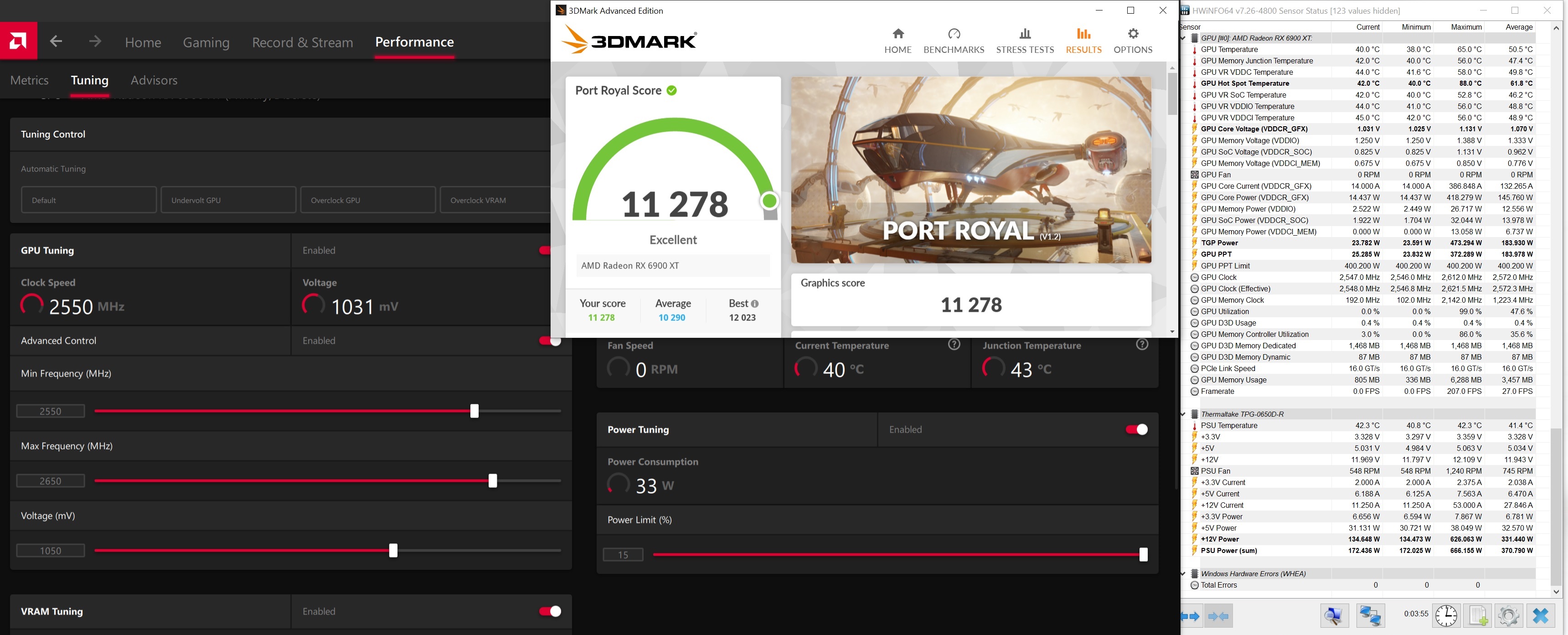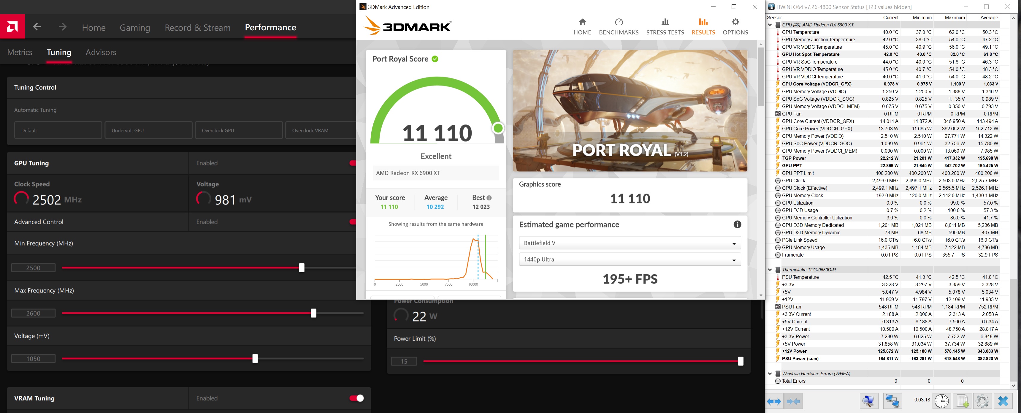 При выставленных 1025 мВ ситуация не поменялась. Как я помню, то у меня и на стоковом охлаждении с ограничением PL в районе 270 Ватт такой андервольт через драйвер тоже ни черта не делал. Совершенно бесполезная для моей карты опция - видяха берёт вольтажа сколько ей надо и плевать она хотела на то, что я там в драйвере накрутил. И работает у меня только ограничение максимального вольтажа в MPT.