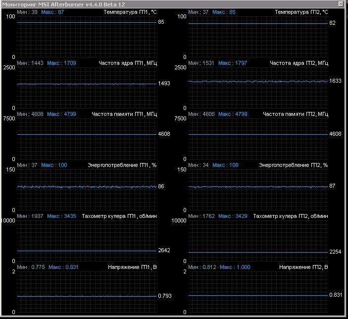 Не знай у меня таких проблем нет, есть OverBoost на ВК, который заводом заложен на аппаратном уровне и равен он 15МГц. На счет скачков, ну как сказать наверное это зависит от конструктивного расположения ВК, СО, а также конфигурации в целом. У меня все синхронно, конечно если игра или приложение под SLI или просто Multi GPU крайне хренова оптимизирована, тогда возможны перекосы в сторону первого видеоадаптера, так как SLI нарушается в целом. Ну а так ради интереса сделаю видос с мониторингом по обеим ВК под нагрузкой и переменными средами, тогда станет ясно правильно ли я понял или нет. Сегодня вечером постараюсь кинуть.