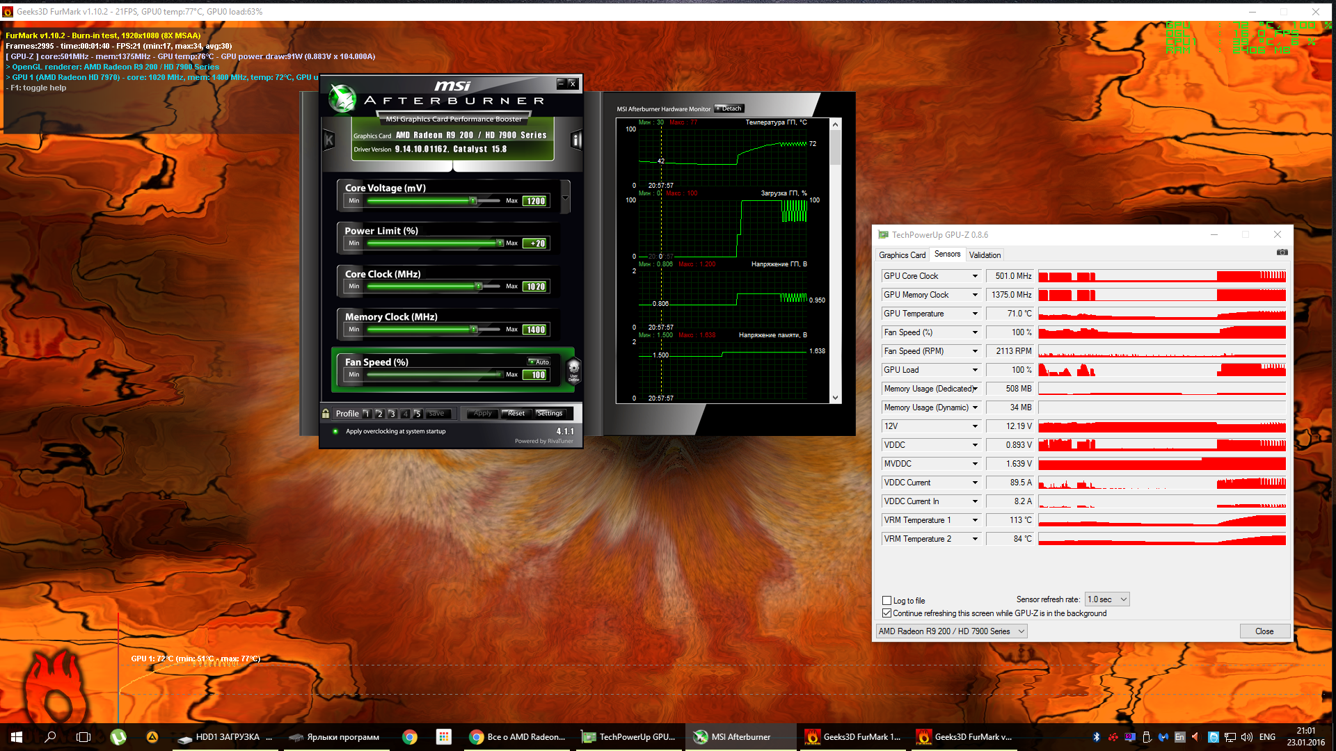 Ни как не могу свою нормально разогнать( Может видюха такая попалась. По чипу максиму 1020мгц (что с повер лимит +20 что без него) напругу макс ставил 1.250v Память вообще лучше не трогать 1400 это наверное предел. Пол часа в батле4 и виснет намертво со скрежетом в наушниках.