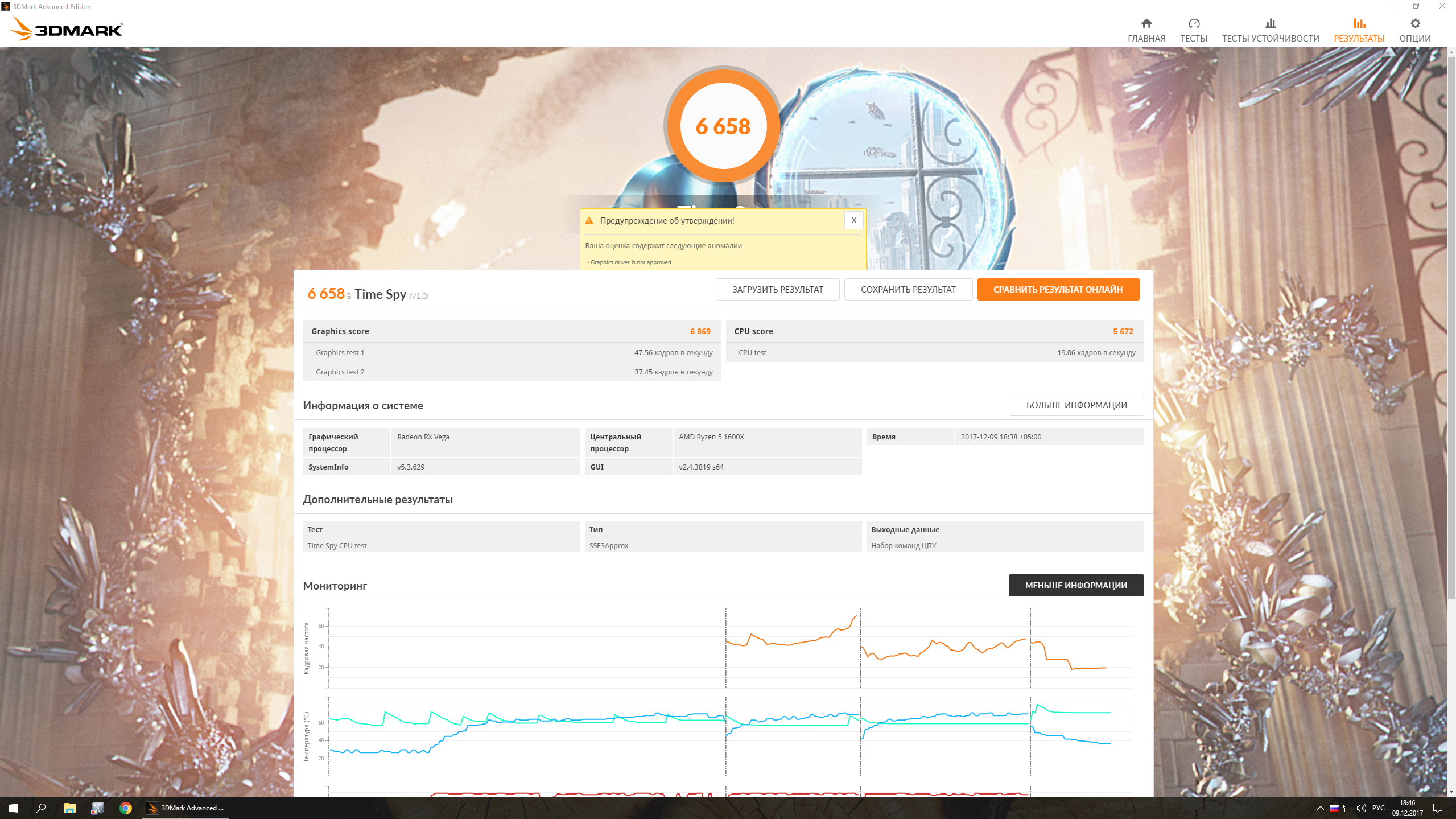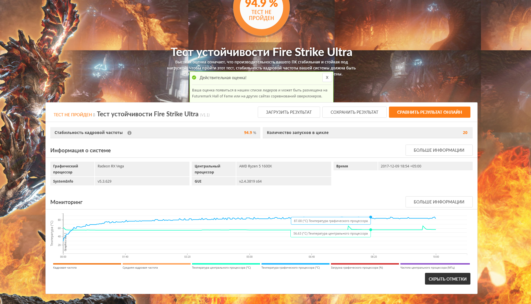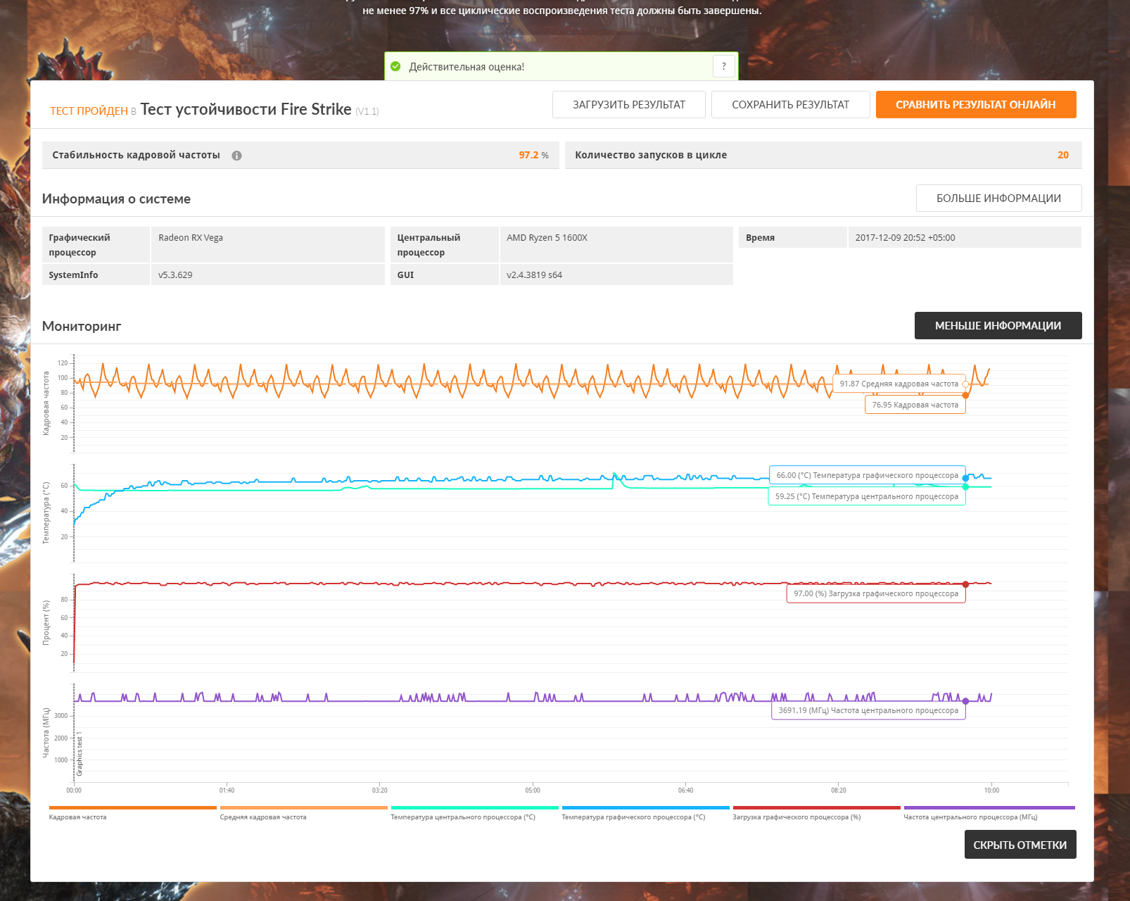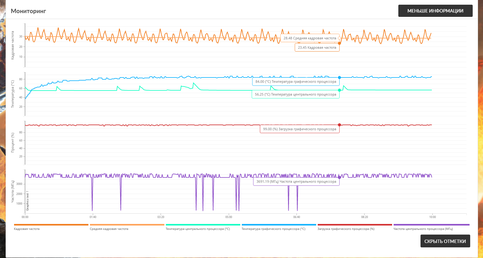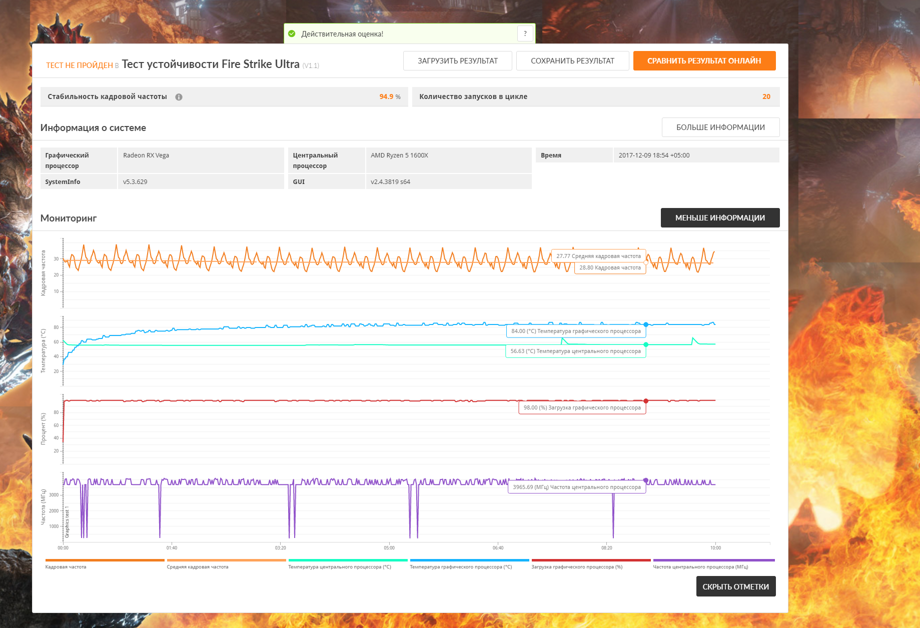 Вроде весь тест. Проценты не написал. Повторно попробовал пройти сразу-же результаты были на порядок ниже, тесты сопровождались слайд-шоу а не плавной картинкой. Ну это же не нормально когда с 2-5 попытки 3д марк запускает тест, при чем только резет помогает.