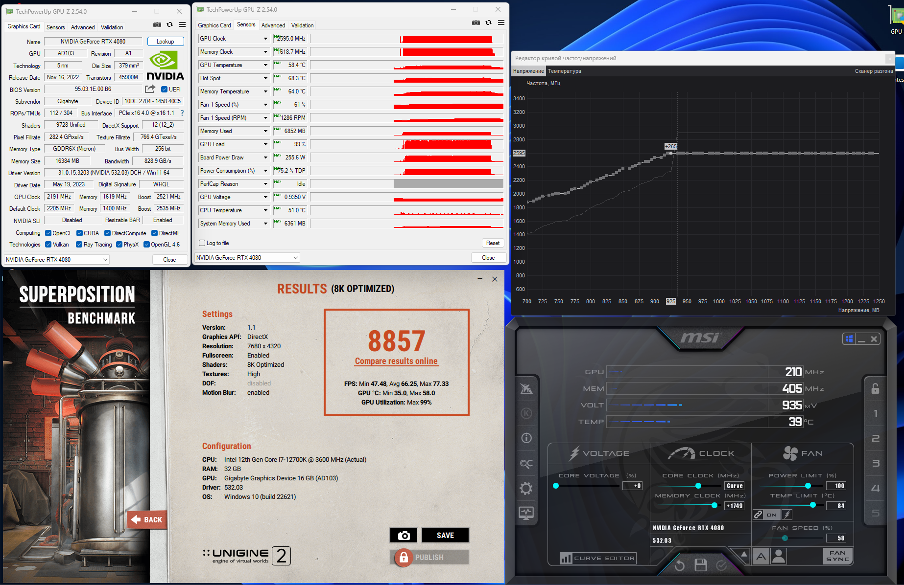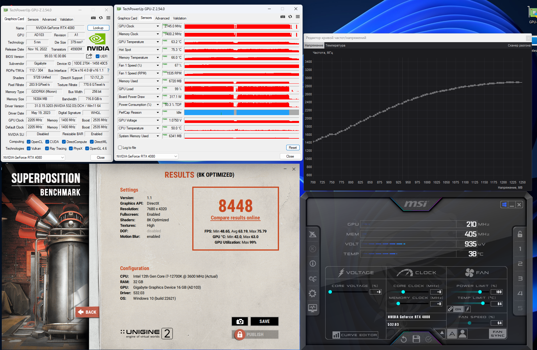 Конкретно из собственной практики со своей 4080, могу поделиться опытом: Вариант на постоянку выбрал - 2595@0.925, снижение производительности из-за понижения частоты чипа компенсировал разгоном памяти, ползунок +1699. Так же есть рабочий конфиг - 2670@0.950, так же никто не запрещает использовать с разогнанной памятью. Я не преследовал цели прям сохранить заводские 2715-2760. Для стабильных 2745 мне нужно напряжение 0.975, а это не так голодно и холодно, как 0.925, поэтому всё же 2595@0.925 + 1699 память это мой выбор. Рекомендую для первоначальной проверки стабильности использовать запуск теста 3DMark Port Royal. 1-2 прохода для первоначальной проверки. Когда всё хорошо, то пройти тест стабильности (20 кругов этого теста). У меня например были вылеты на 12-15 проходе например. Понизил частоту на 15 Mhz и прошёл тест. Дальше другие тесты, бенчмарки и конечно же реальные игры. Но после прохождения 20 кругов теста стабильности 3DMark Port Royal у меня ещё не одна игра не крашнулась.