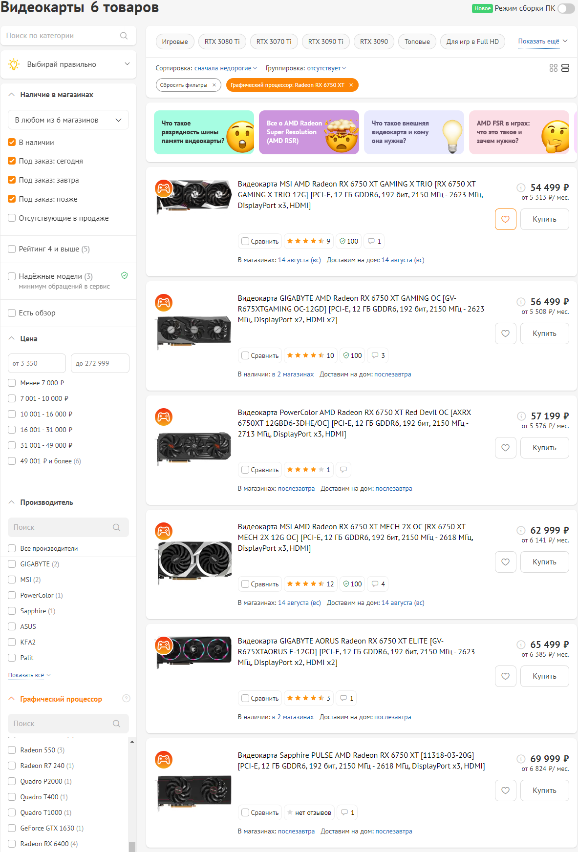 Выбирать особо не из чего было всего 6 видюх 6750xt, и для меня мси лучшее исполнение, вентиялторы там правильные вплане лопастей, как у тех что для водянок и кулеров, с агрессивными углами и плотненько. Гига горячий калл, у реддевила вертушки фуфло, лопасти редкие и плоские как у вентиляторов которые на поток а не на давление. В ситилинке предоплата нужна (совсем охерели). Онлайн трейд тоже мониторил выбирать не из чего, та же мси 62к. Озоны и прочие не рассматривал кроме LimeStore, но блин опять предоплата. В ДНС была в наличии, не вскрывалась, осмотрел купил. Но на ньюэге она вообще 480 баксов, сладкая цена, но т.к. я живу в мордоре мне таких цен не видать.