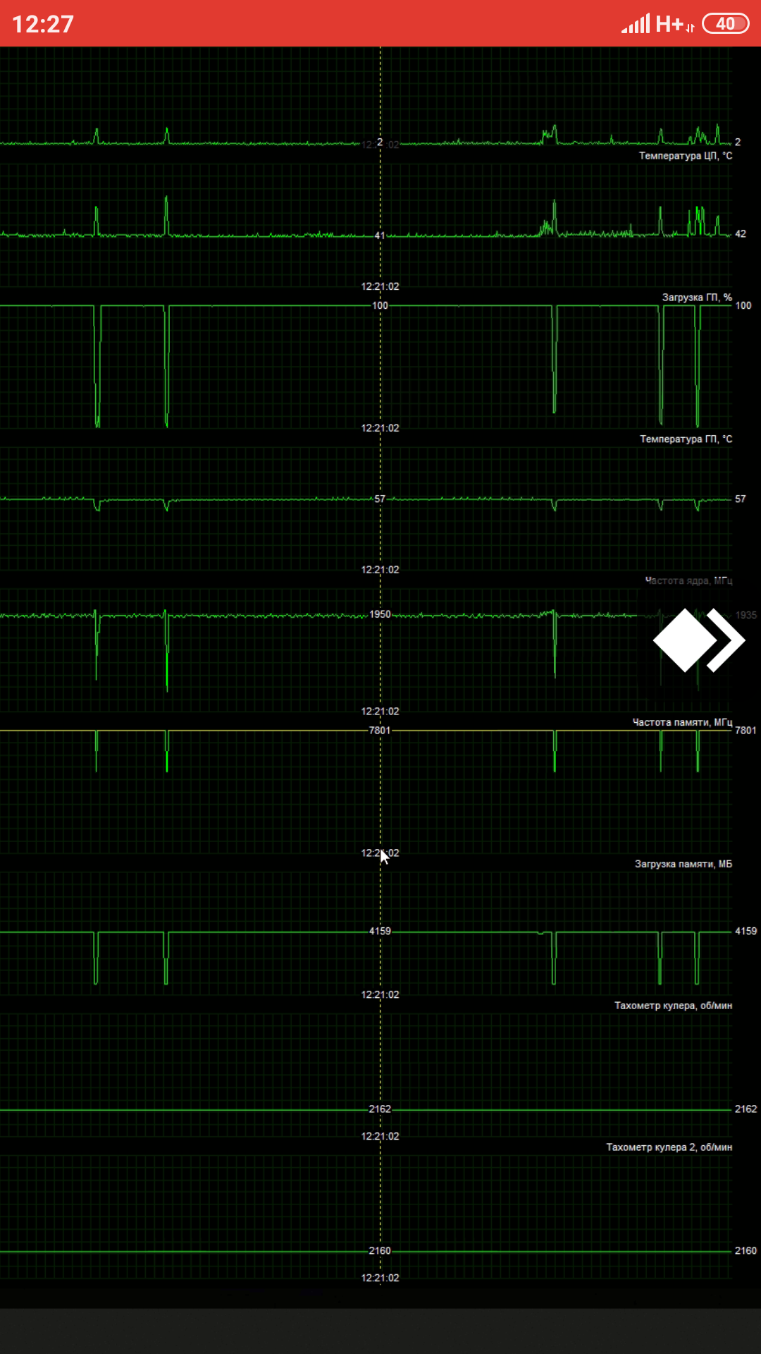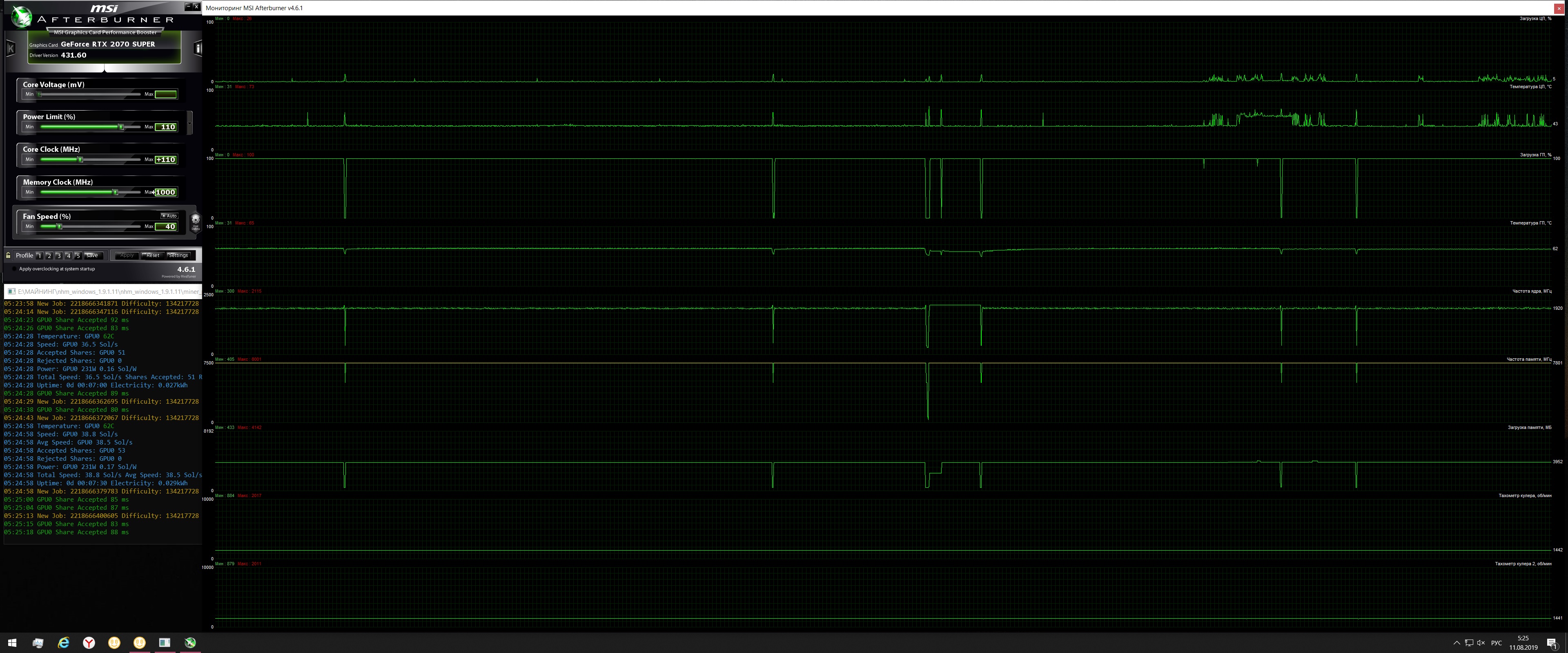 Устроил настоящий стресс-тест своей карточке))) Все еще питаю надежду, что вертушка одумается - в целом-то карта неплохая. Хотя вряд ли: проверил только что - так же трещит. Поставил на ночь майнинг, вертушки принудительно на 40% (1440 оборотов). Так карта работала часов пять. Можете посмотреть - примерно час поймал с таймкодами. Что интересно - корпусная вертушка, подключенная к видеокарте, заработала - т.е. карта ее все же "призвала" на помощь, не имея возможности разогнать собственные вентиляторы))). Условия тестирования: Температура "за бортом" (в комнате) - 26 градусов. Фото корпуса прилагаю (более подробно - посмотрите по ссылке https://3dnews.ru/939830). Боковые стенки, передняя и верхние панели оклеены шумопоглощающим материалом, от которого, на самом деле, толку не так много, так что берите смело лучше любое "решето", но + хорошие тихие вертушки. У меня спереди 3*140 термалрайт, на кулере - такая же, сзади и сверху две на выдув - родные сильверстоун. Они трехконтактные, работают на одной скорости, но очень тихие. Несмотря на то, что воздух забирается и выводится через "жабры", продув вполне приличный. Но верхнюю крышку я все же снял. Обороты вертушек корпуса - 800. Итак, в течение пяти часов карта на вышеуказанной скорости работы кулеров нагревалась не более 62 - 63 градусов, что, на мой взгляд, отличный результат. На этой скорости карту не слышно - звук ее вертушек сливается с корпусными. Если ставлю на автомат, обычно держит температуру до 60 градусов, при этом разгоняя вентиляторы в районе 45 - 50. Ночью разница чувствуется, но совсем немного, днем - почти не ощутите. Но в идеале лучше их держать до 45, и совсем оптимально - до 40. Частоту памяти держит 15 600, а чип скачет в районе 1900 - 1950. Как вы видели, в 3Д-марке показатели могут быть и выше, да и в игровых тестах тоже. Но майнинг шлет все эти тесты к чертям))) Так что такие дела. Еще будут какие вопросы - задавайте, возможно, завтра этой карты у меня уже не будет. Сложно сказать, нам ли с коллегой по цеху так не повезло (вроде бы даже проблемы с одной и той же вертушкой по расположению - ближней к задней стенке корпуса) или это брак первых обновленных партий, или вообще проблема такого типа вентиляторов - надо поискать инфу в интернете. Но если отбросить этот момент - карта реально неплохая, холодная и тихая на оборотах до 1500 - 1600, которых при условии хорошего продува корпуса хватает с головой. И да, бэкплэйт теплый - в любом месте могу приложить руку в полной нагрузке и спокойно держать. Для сравнения моей 1070 гейминг х явно не хватало радиатора - была довольно горячей. Но трио 2070 - 2080s, говорят, по охладу чуть ли не еще круче.