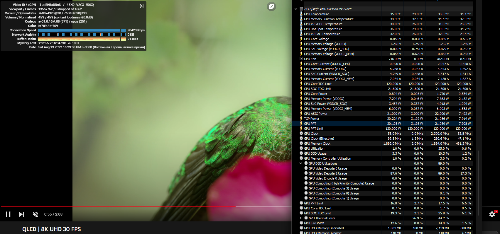 Похоже что не работает декодер, или амд сделала ультра крутой декодер (шутка, это не про амд). 55w это чуть выше фон потребления, никак не прокрутка 8K@60fps. У меня на это ест ~125w c загрузкой декодера в 55-60%.