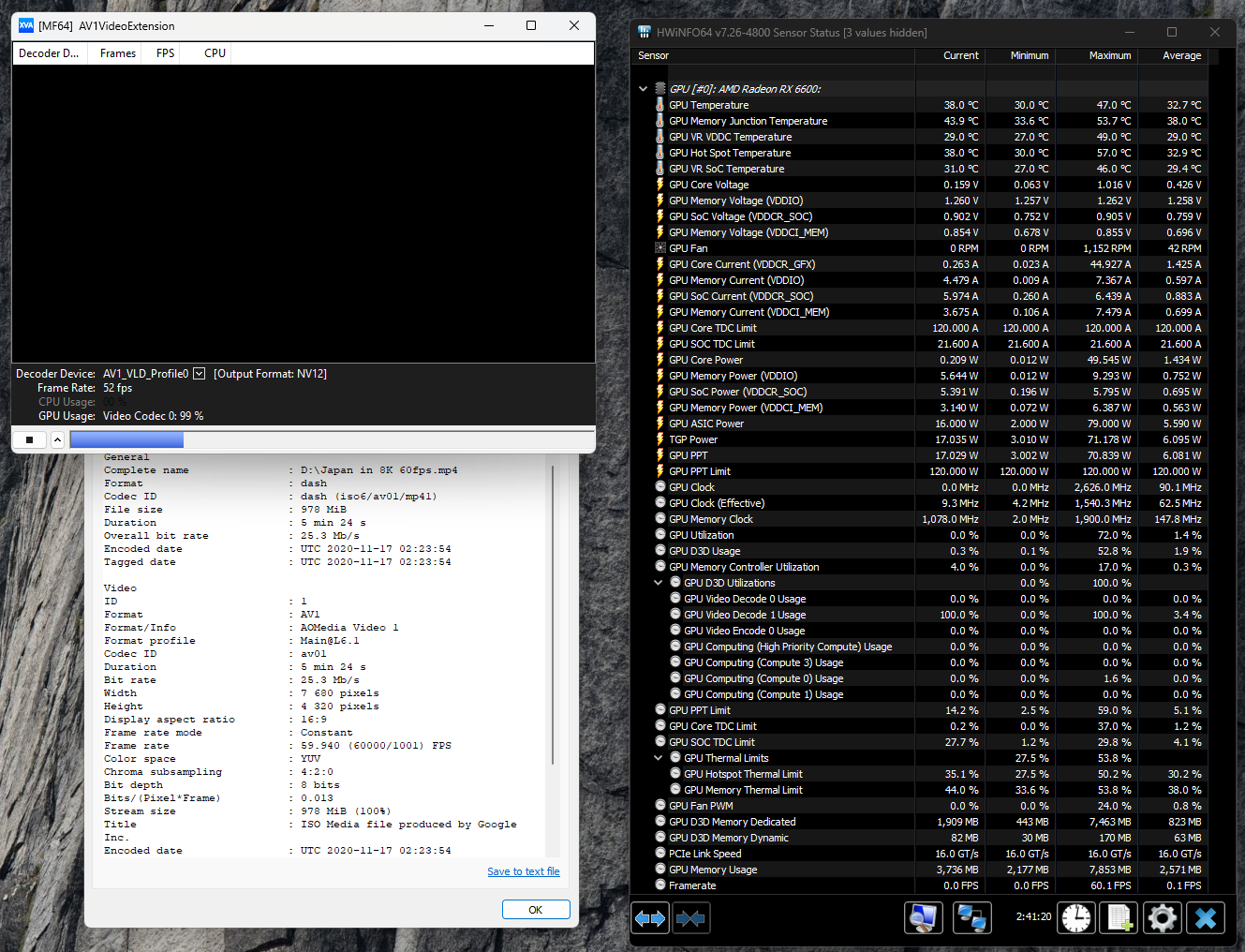 Добавлено спустя 3 минуты 12 секунд: Alex_Str Первым делом это расширение установил. Хрень все это - я писал уже, что сохранял стрим на диск с ютуба и видео так же абсолютно лагает в ffmpeg. Какой браузео - роли не играет вообще, они все щас поддерживают av1 hw decoding через dxva2. Проблема 100% в бэкенде. Navi23 более свежий чип, возможно что-то успели доработать.