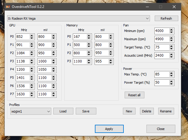 Gorod Круть. Сам хотел, но лениво было. Ручную частоту ставить не обязательно. Я бы даже сказал, что вообще не нужно. Вега крутит частоту от вольтажа. И пофигу ей, какую частоту ставить. По сути на Веге нужно крутить только вольтаж в поисках минимального стабильного вольтажа. А максимально рабочая частота сама установится автоматически в зависимости от удачности карты. У Олегджуса, например, это 1520. У меня 1580. У тебя, вон, 1540 получилось.