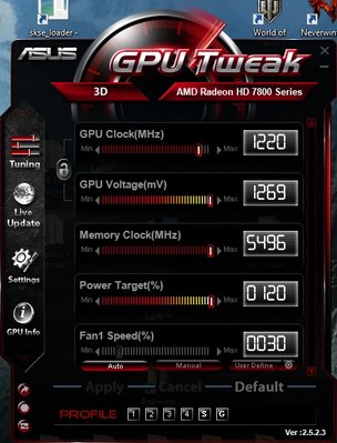 Всем доброе время суток! Взялся вплотную за разгон моей HD 7870 Sapphire ghz edition Dual-X. (ASIC Quality 76.5%) Cтранно, но напряжение мне позволило менять только ASUS GPU Tweak. Дошёл пока до такого: