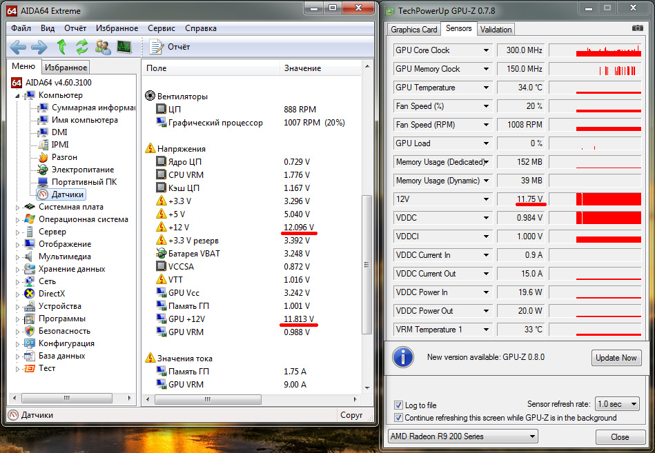 Чем мониторили? У меня в GPU-Z тоже заниженное напряжение показывает, вместо 12v всего 11.75v, хотя при проверке цифровым тестером и в AIDA64 по линии 12v никаких отклонений на выходе БП нет. Где-то попадалась информация, что это вольтаж на самой карте. Так-что желательно еще мультиметром проверить. Специально сделал скриншот для сравнения показаний AIDA64 и GPU-Z.