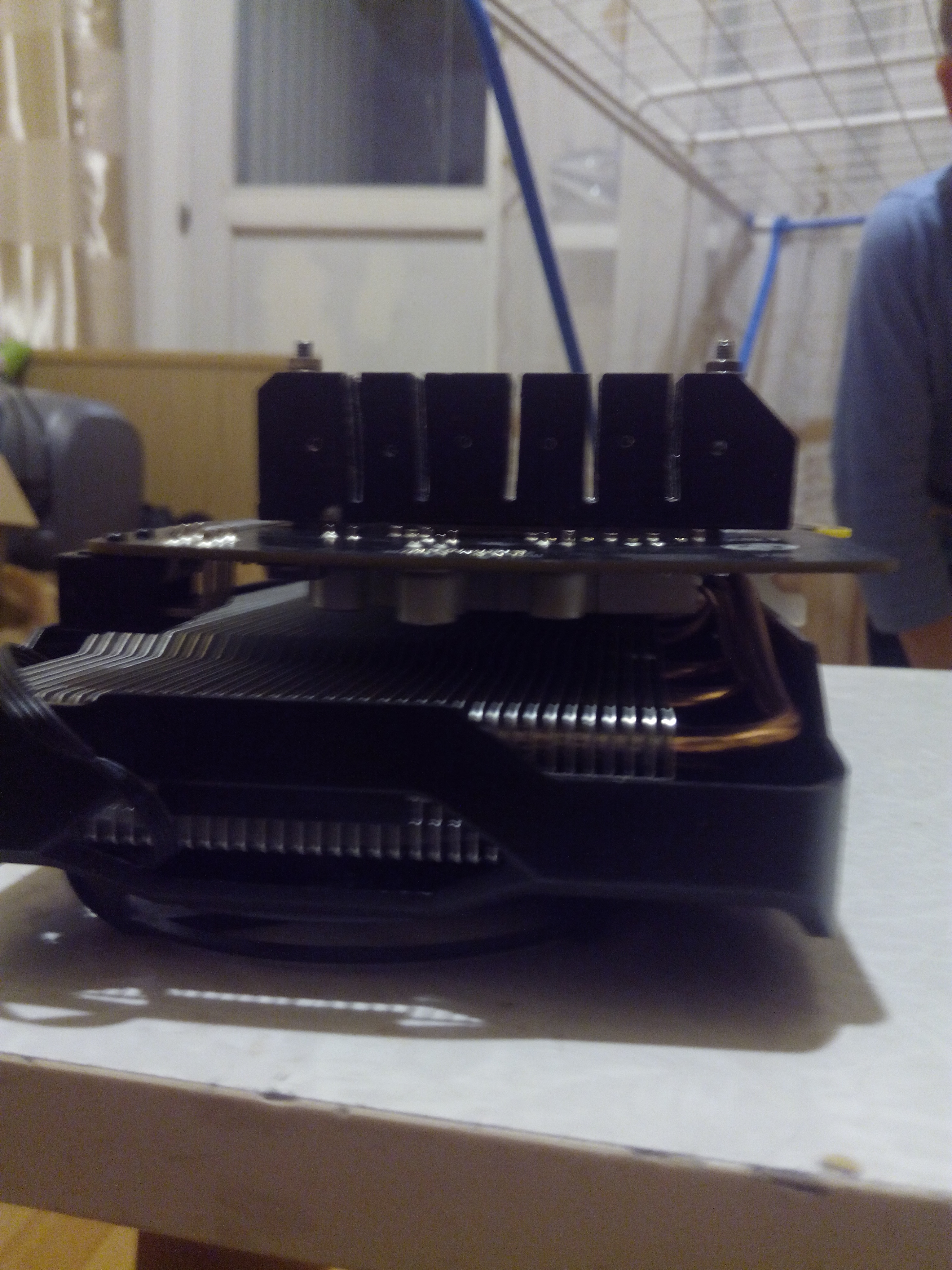 Тонкие нельзя.Так как пластина будет касаться контактов.Во избежании этого 4 ограничительные втулки ставятся высотой 3.5мм Фотки в сборе этой СО на сайтах магазинов есть.Вот ролик с ютуба.Установка на GT}{1060. Но я бы не рисковал укладывать комплектные прокладки на открытые контакты. Arctic Cooling Accelero Twin Turbo III -это с бекплейтом.В сборе 4 слота.2 в торону от проца,1 сама ВК и 1 в сторону проца сам бекплейт.Он-то и не дает встать,цепляясь за блок USB портов и выходов звука. Arctic Cooling Accelero Twin Turbo II-в продаже не нашёл.Поставка без бекплейта,но с кучкой маленьких радиаторов. У меня с прошлой ВК осталась Arctic Cooling Accelero Mono PLUS с комплектом мелких радиаторов.Их использовал на память и VRM со стороны проца. Ща на работе укоротил бекплейт.Из обрезка сделал ещё узкий радиатор,что бы аккуратно между контактами встал на место,где с обратной стороны жарит VRM.Дома поприкладываю,посмотрю какая конструкция получше.Больше склоняюсь с установкой узкого на более тонкую прокладку.Можно и на клей,но вдруг снимать придётся.Но с бекплейтом смотрится понадежней+планка жесткости прикручивается к нему. Какая конструкция придется по душе,ту и сфоткаю Вариант с полным бекплейтом меня всё таки не устроил.. Мается душа класть 4-х мм прокладки.Со временем может укорочу на миллиметра 2 втулки и простелю бесконтактные места более тонкими и не мокрыми прокладками.Но пока буду пользоваться узким отпилышем на тонкой прокладке.Вроде хорошо тепло отбирает.Сделал на нем поперечные пропилы и отверстия для улучшения конвекции.Красить не стал