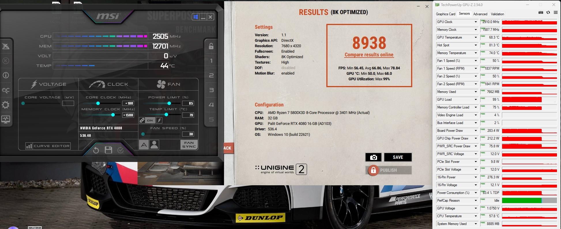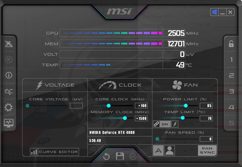 Выставил ограничение по потреблению на 85% Ядро +100 Память +1500