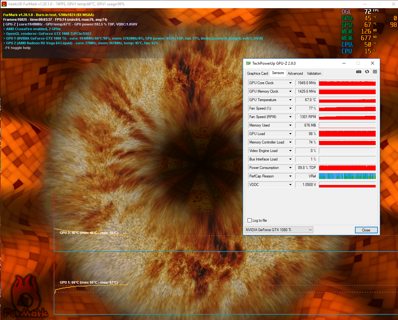 фурмарк сильно греет - ни одна игрушка так не греет майнинг греет 58-60 + вы не обратили внимание что она там не одна в корпусе, есть напарник) , и вторая карта - только только сняла нагрузку - еще обороты не упали даже