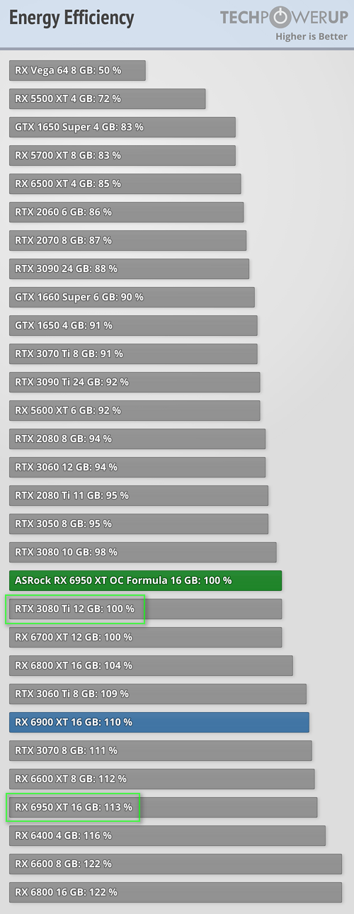 Я бы так не сказал, 6950ХТ в разгоне выдает ту же энергоэффективность что и 3080Ti без разгона...а вот 3080Ti с разгоном скатывается ниже чем RTX 2000.