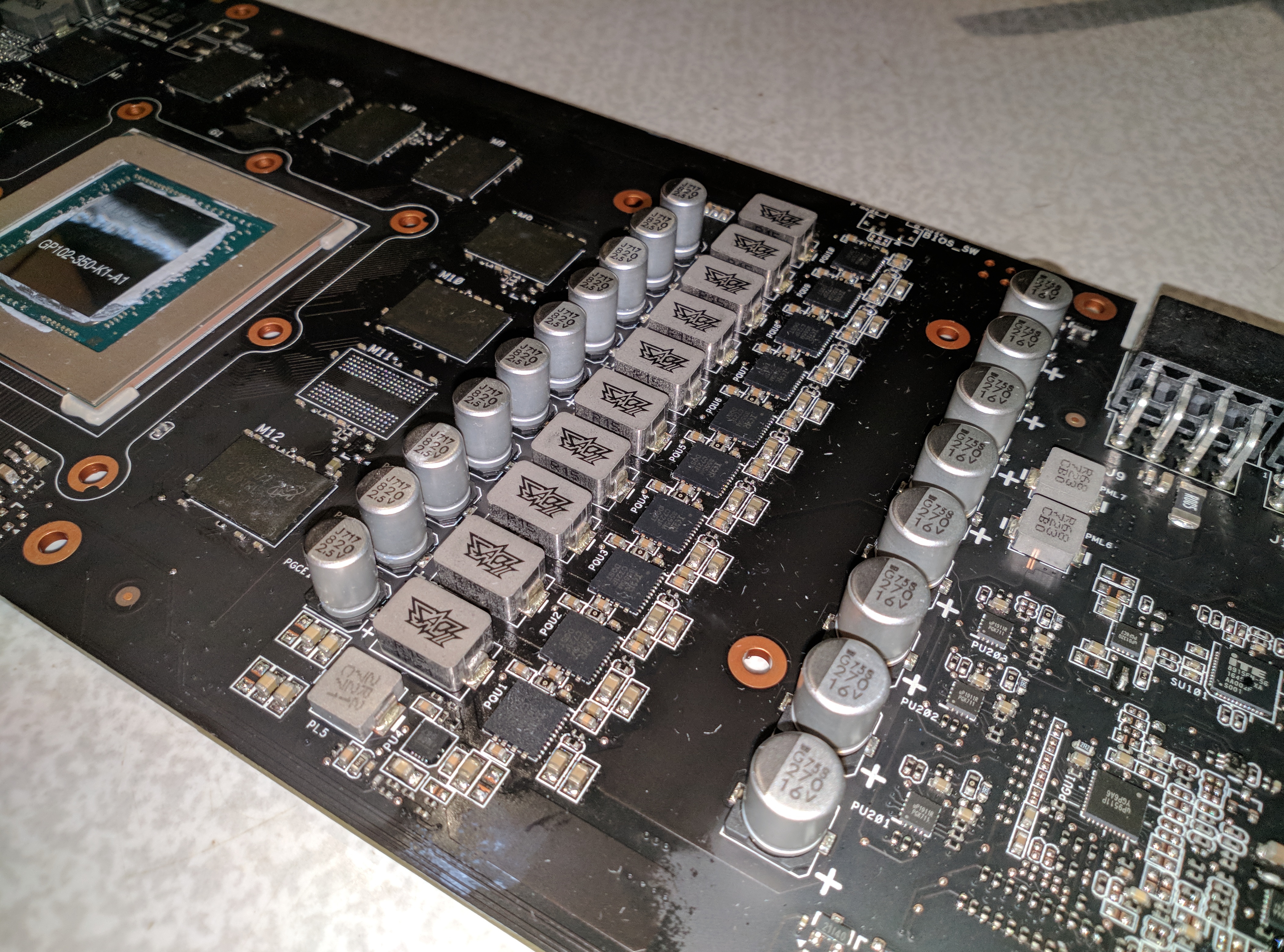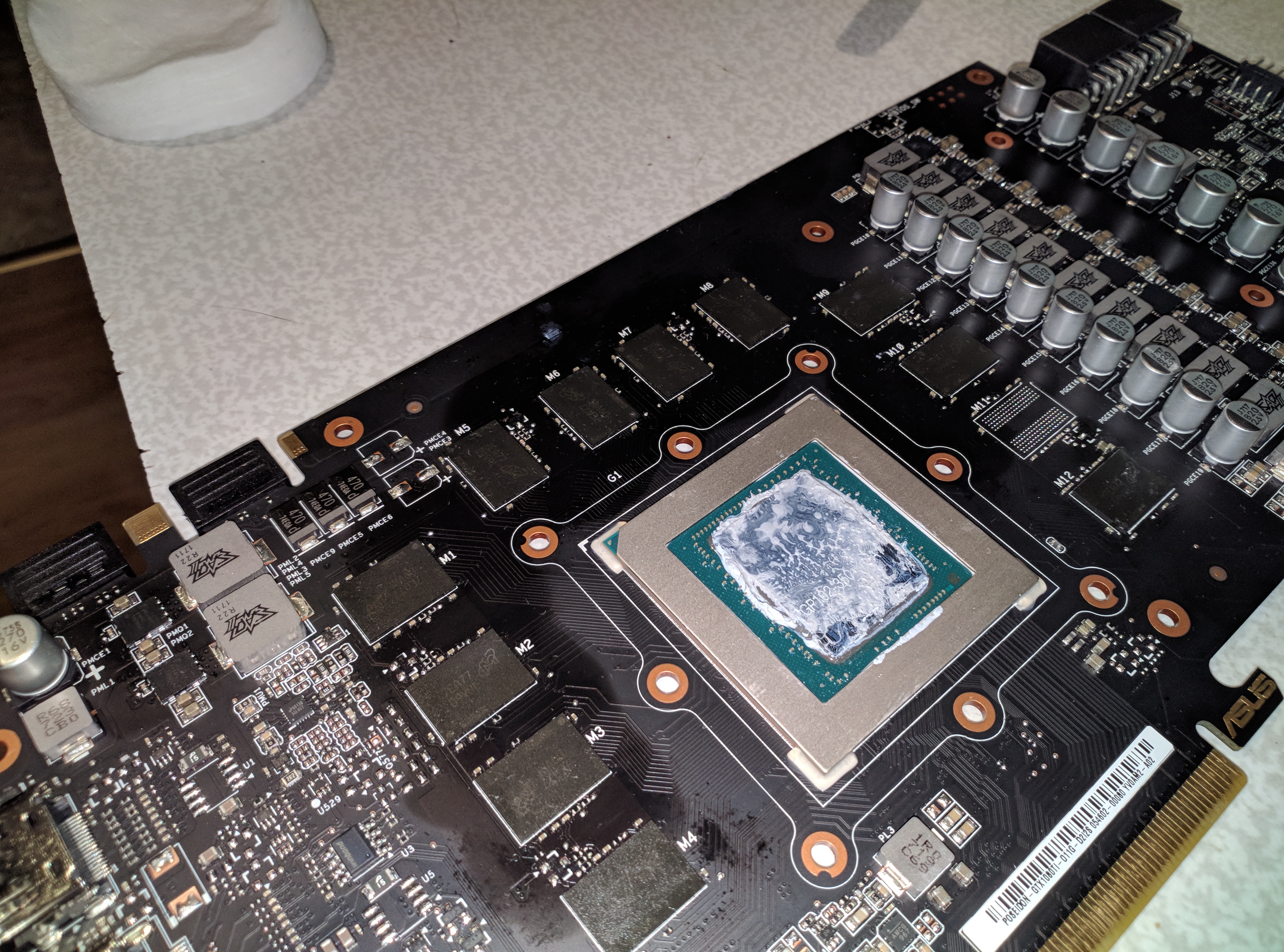 В общем расскажу свою историю, больше для статистики, может кому интересно. Профильный комп с СВО. Жара на улице 30 градусов. При полной загрузке видеокарта начала выползать сначала из 70 градусов, потом уже из 80. По asus GPU Хрень максимальная температура достигла сегодня аж 87 градусов. Я уже давно раздумывал о водоблоке нормальном, к тому же собираюсь взять вторую карту и сделать SLI под водой... Это всё будет позже и я думал дотерпеть до осени, но такая высокая температура меня напугала и я решился разобрать карту и поменять термопасту. Сначала неудачно пытался разобрать карту без разбор контура, не удалось - винтики со всех сторон + я фитинг отошёл. в итоге слил жижу из половины контура(вторую половину с помпой и радиатором быстросцепами сцепил), разобрал карту и УЖАС. Сначала я подумал, что я умудрился залить её из отошедшего фитинга, но потом присмотрелся, и понял что текут термопады. Потекли они так, что на питании оно аж на другую сторону платы жиром вышло. Протёр как мог, спирт эту хрень не берёт... Протирал тряпками и ваткой. Сменил пасту, протёр термопады как мог(у меня таких толстых нету, они там под 2 миллиметра), со второго раза собрал обратно контур, вытряс воду, запустил. Работает. Нагрузил на 95-100%. Температура карты(чипа) даже до 45 не дошла. Воздух за окном 24 градуса. Вот так вот... Я думал только гигабайт текут. Карта покупалась в CU осенью 2017, ей меньше года. Всегда охлаждалась с водой... Был об asus лучшего мнения...