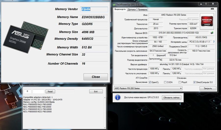 Пишу повторно,потому что уже бесит,это первая заморочка с чем не могу разобраться.Замучил наших забугровых друзей тут http://www.overclock.net/t/1443242/the- ... hread/3430 но общаться с ними проблемно.Имею : ASUS R9290-DC20C-4GD5 DirectCUII OC Совместимые адаптеры обнаружены: 1 адаптер # 1 PCI ID: 1002: 67B1 - 1043: 0470 Config памяти: 0x500013A9 Elpida RA1: F8000005 RA2: F8010000 RB1: F8000005 RB2: F8010000 RC1: F8000005 RC2: F8010000 RD1: F8000005 RD2: F8010000. Понимаю что карта должна разлочиться .Раз 30 шил разные биосы от 290X,спасает только второй биос.Монитор даже не инициализируется,как будто спит,хотя слышно как грузится винда.Месяц назад забил,но появилась информация о разлочке моей карты,попробовал их биос,та же песня,монитор не просыпается????Кстати монитор сейчас HP 23XI.Тупо горит оранжевым,откатываюсь на родной биос сразу норма!!!!!Куда копать уже не знаю.Оно в принципе и не особо надо,но спортивный интерес присутствует.Спасибо!