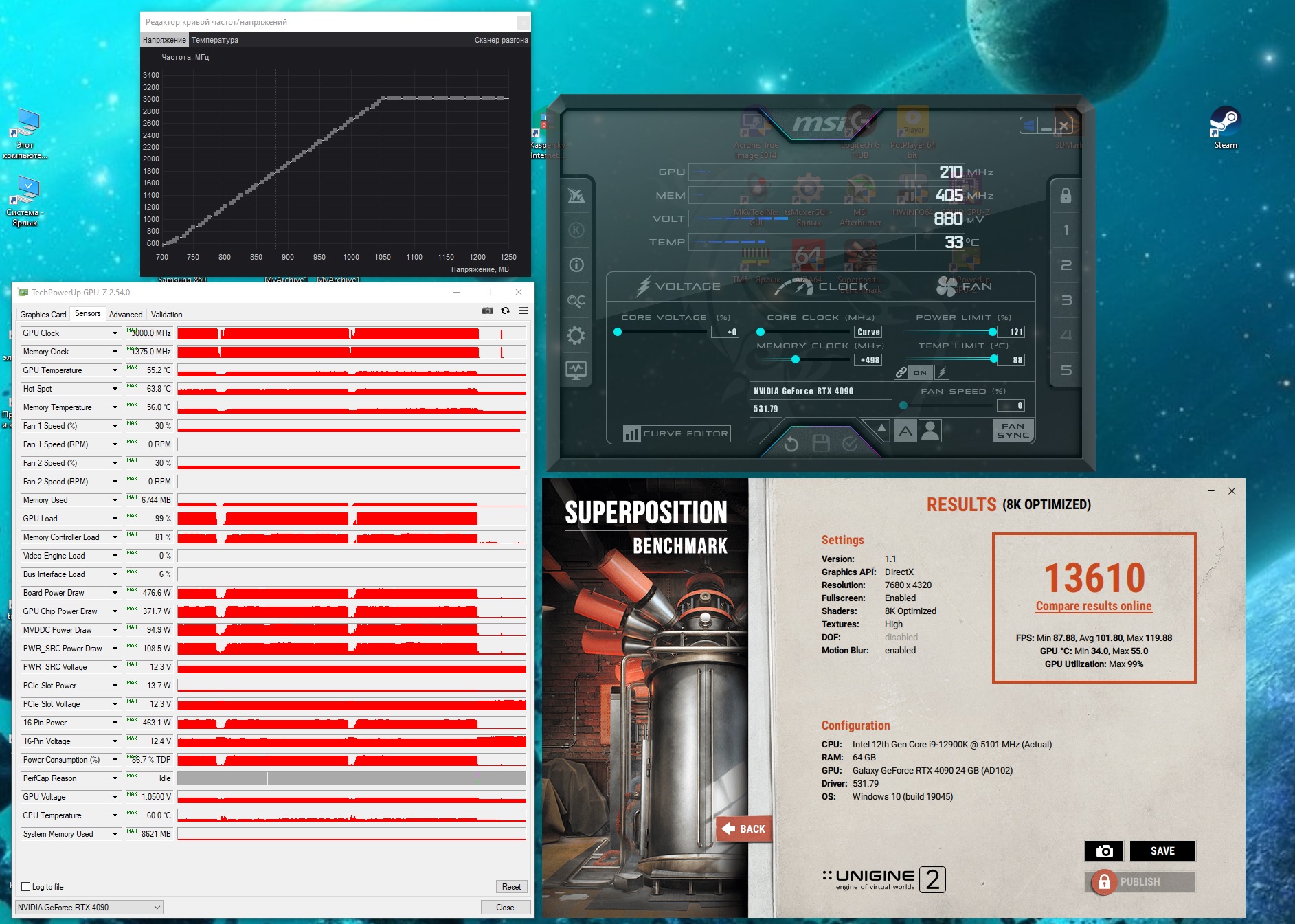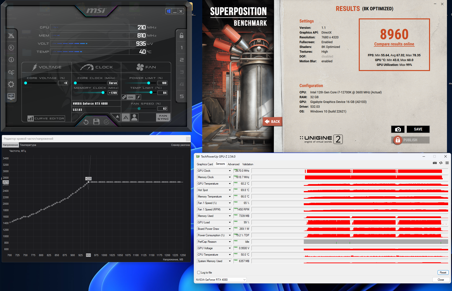 А какая температура чипа, памяти? Чтобы сравнить давайте позапускаем Superposition в 8К (три прогона), с запущенным GPU-Z (фиксация показателей на MAX)