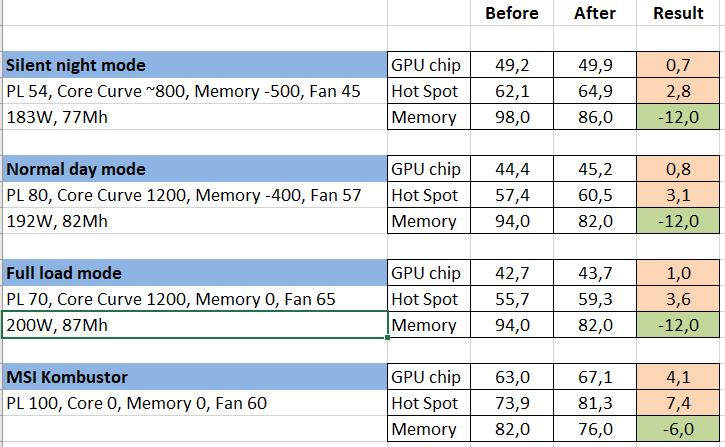 16.09.2020 - создание темы, добавление ссылок на обзоры RTX3080 17.09.2020 - обзоры Palit RTX 3080 GamigPro OC, MSI RTX 3080 Gaming X Trio, Asus TUF RTX 3080, Zotac RTX 3080 Trinity, информация по блокам питания 19.09.2020 - обзор Gigabyte RTX 3080 Eagle OC 10G, Nvidia RTX 3090 22.09.2020 - косметические правки, добавление ссылок 23.09.2020 - добавление базы данных с сайта overclock (спасибо coka) 24.09.2020 - добавление обзоров 3090 26.09.2020 - полезная информация по видеокартам Аmpere (алгоритм работы вентиляторов, причины проблемы с boost), и другое 30.09.2020 - дополнение к полезной информации, добавление обзоров RTX 3090, правки в оформлении 02.10.2020 - начато заполнение F.A.Q. 06.10.2020 - начат сбор статистики по видеокартам 08.10.2020 - добавлена информация по видеокартам Palit RTX 3080/3090 серии GamingPro и GameRock от Palit Support 09.10.2020 - в F.A.Q. добавлена информация по видеокартам Palit, поддержке VRR и прошивке BIOS. Косметические правки 10.10.2020 - добавлены ссылки на обзор архитектуры Ampere. В F.A.Q. добавлена информация по GPU Boost и лимитам. 29.10.2020 - добавлены обзоры на RTX 3070 от разных вендоров 31.10.2020 - информация по драйверам 04.10.2020 - в F.A.Q. добавлено пособие по работе с кривой MSI Afteburner 06.11.2020 - изменения в F.A.Q. по отличию видеокарт Palit 18.11.2020 - добавлена информация в F.A.Q. по BIOS от Palit и EVGA 20.11.2020 - дополнен F.A.Q. (достаточность RTX3000 для FHD/QHD/4K мониторов) 25.12.2020 - дополнена полезная информацию по картам 28.01.2021 - пример настройки курвы 03.02.2021 - обзор EVGA 3080 с андервольтингом 04.03.2021 - добавлена информация по замене термопрокладок на RTX 3080 31.03.2021 - добавлен BIOS с поддержкой Resizable BAR от Palit 05.08.2021 - добавлены обзоры 3080, 3080Ti, 3090 от occlub 12.02.2022 - добавлена информация по термопрокладкам 21.02.2032 - добавлена информация по термопрокладкам от T[]RK