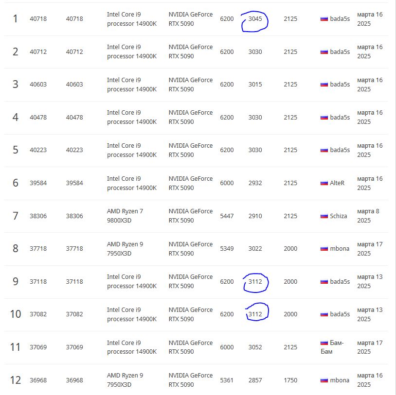 Но честно говоря, больше похоже на то, что кто то упарывается с этими результатами чего то подгоняя софтом. Вон тот же неадекватный бадасс, которого тут давно забанили упарывается. То у него 3112 по чипу и результат 37К, то на 3045 каким то волшебством сделал 40К.