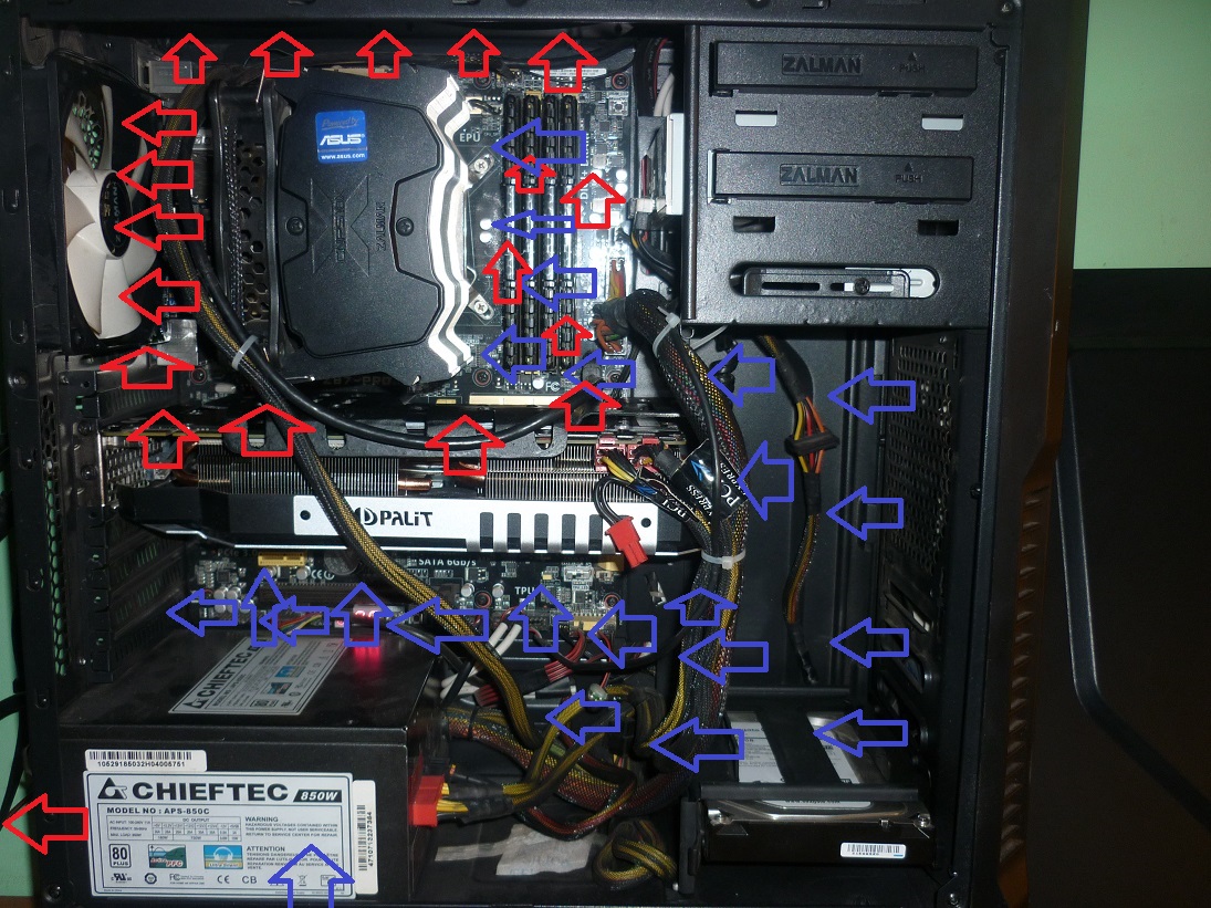 ShurizloСлабоватая вентиляция корпуса. Мое виденье того, что надо сделать. БП перевернуть вентилятором вниз. Там 100% должны быть отверстия для забора воздуха. В этом случае получится покомпактнее уложить провода, чтобы они меньше мешали созданию сквозняка в корпусе. 8-контактную 12-вольтовую линию для материнки пропустить за другой стенкой, если есть возможность. Снизу и впереди поставить вентиляторы на вдув. Сзади на выдув. Башню повернуть на 90 градусов. Забор воздуха сделать со стороны памяти. Малое расстояние пусть не смущает. Они же друг другу не мешают. Вентиляторы на стенке ставятся на вдув. Ну и неплохо бы, чтобы сеточки-фильтры были хотя бы внизу. Хотя даже с ними пыльно будет, но по крайней мере, не так сильно.