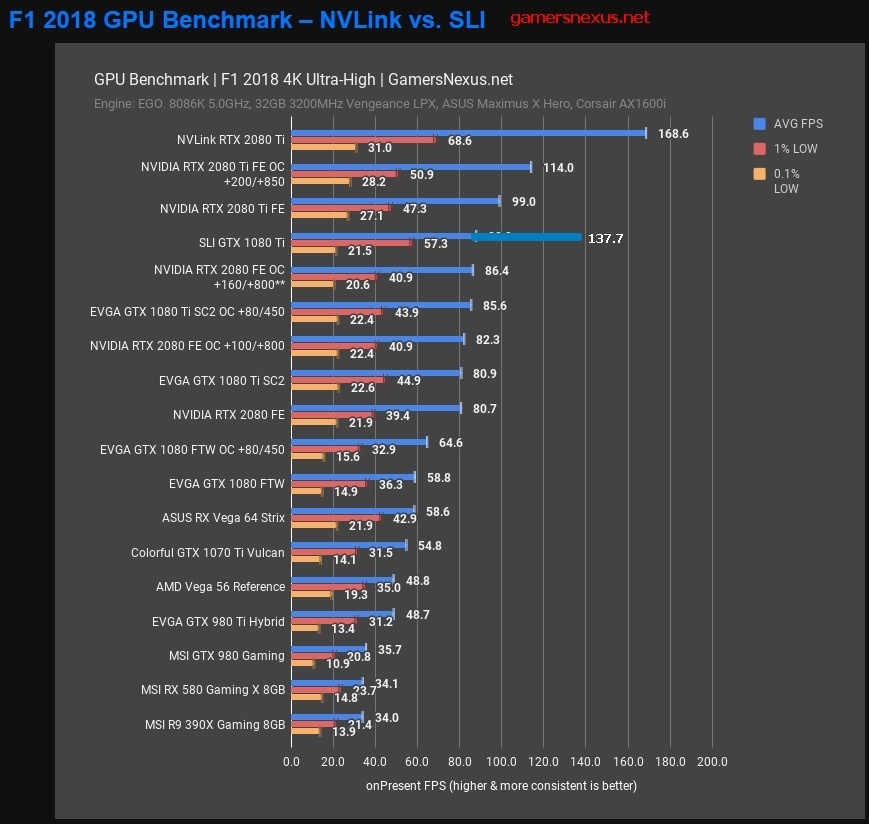 https://www.youtube.com/watch?v=cbvFb0IHTg0 Тесты пошли, но люди не играющие на SLI не имеют понятия куда и на что смотреть. В каких играх даст NVLink вау или не даст... На мой взгляд это последняя Ларка с ТАА и этот парень( с классной причёской) тестует почему то с SMAA. С Вилдланс почему текстуры high, почему макс. загру карт 87% И это только беглый взгляд. Алекс, на всю теорию ложи с прибором, к сожалению см. Вегу всё что отлично выглядит на бумаге в жизни не катит (думаю RT тоже сдохнет) Можно строить много догадок, но без тестов как минимум в моей ссылке они лишь Вангования. По ощущениям нас тут на одной руке можно пересчитать , ты без обид. С уважением. волик