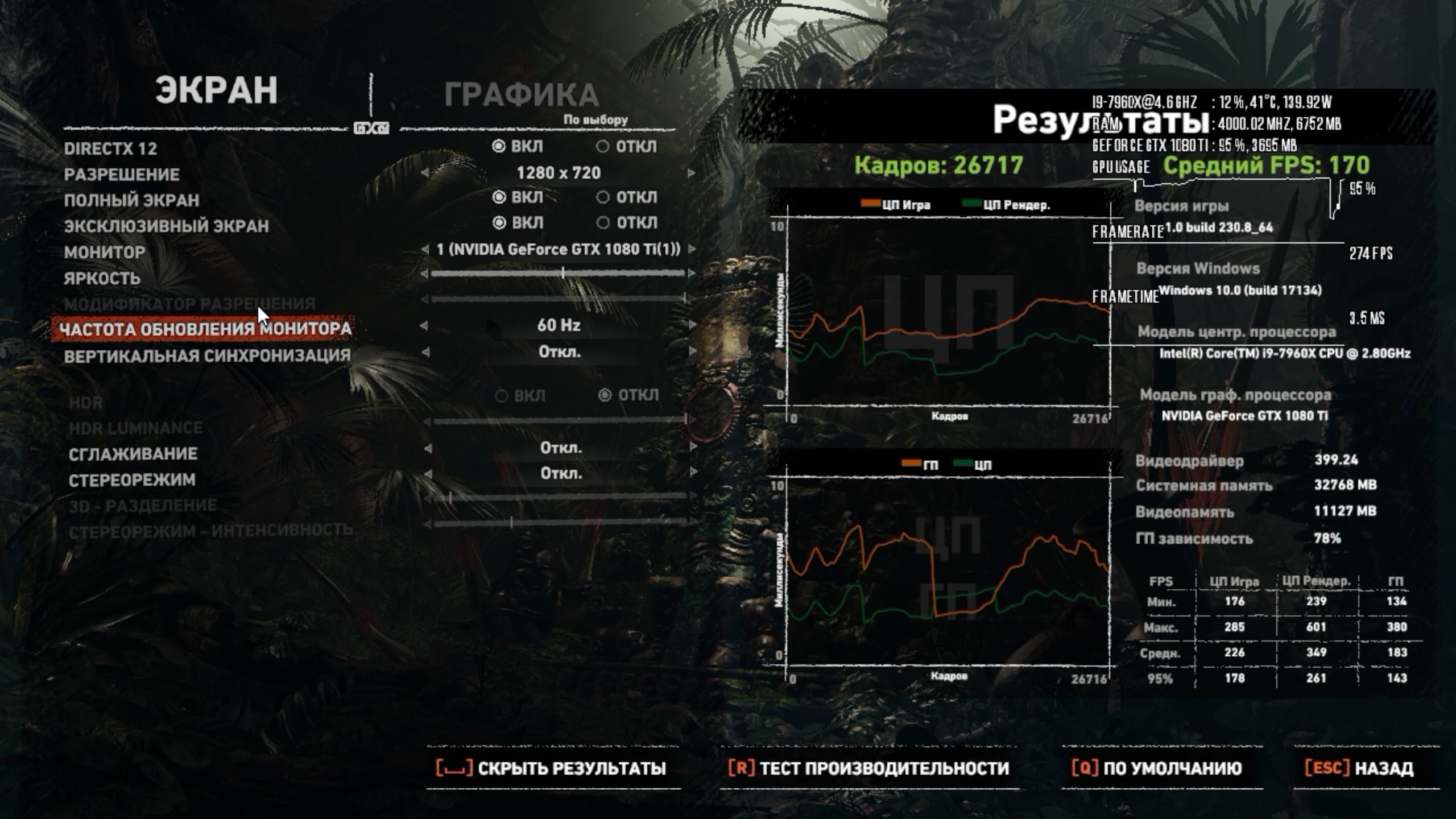 Ну даже по скрину видно, что в DX12 достаточно серьезно упирается в CPU производительность. У меня на 2066 такая потеха, только в одном месте боттлнек виднеется (начало третьей сцены). Что в DX11 у вас - трудно представить.