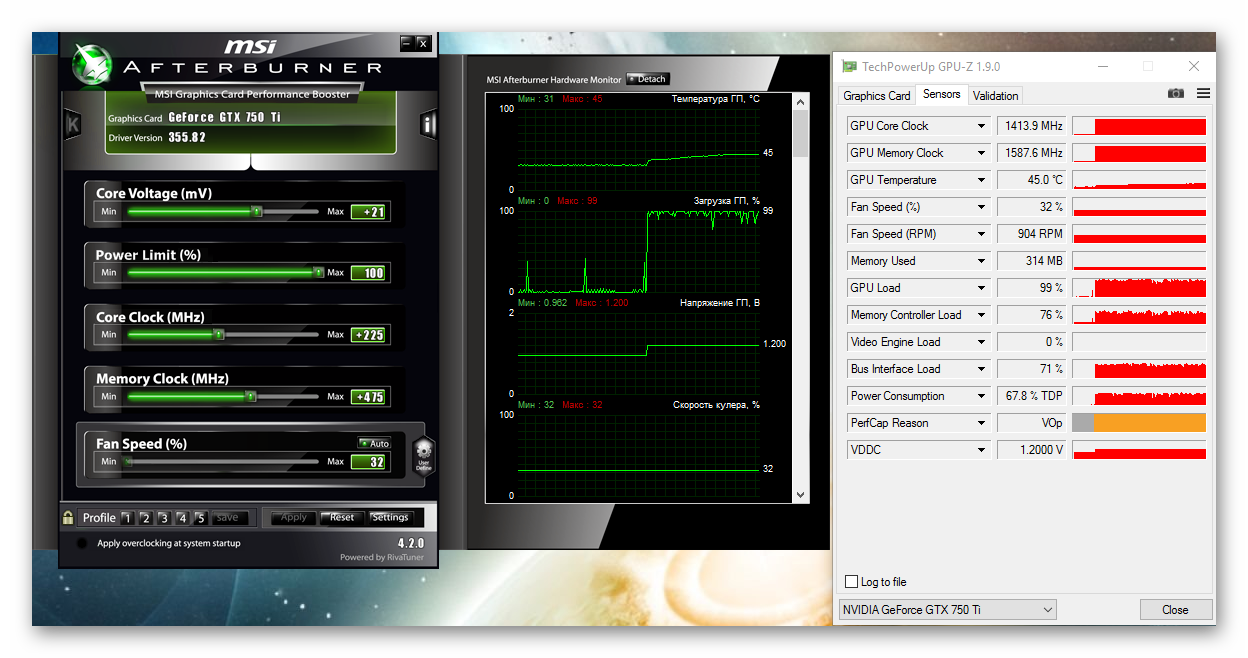 Около двух недель назад, купил MSI GTX 750 Ti Gaming (2 GB), и буквально через пару дней как я приобрёл, в магазине появились Palit GeForce GTX950 STORMX и ASUS STRIX-GTX950 (дороже моей почти на четыре тысячи). Пару дней кусал я локти, из за того что поспешил, да ещё и знакомый приобрёл от ASUS, и всё меня подначивал что у него круче. А в итоге не всё так плохо оказалось, установив "Fallout 4", и насмотревшись всяких тестов, я выставил настройки на средне высоких , и запустил игру в ожидании разочарования, и к большому облегчению игра выдала 55-60 Fps . Далее я решил на свой страх риск, не много разогнать (свою прошлую Palit GeForce GTX 550 Ti, всегда в играх разгонял)... И вот результат:
