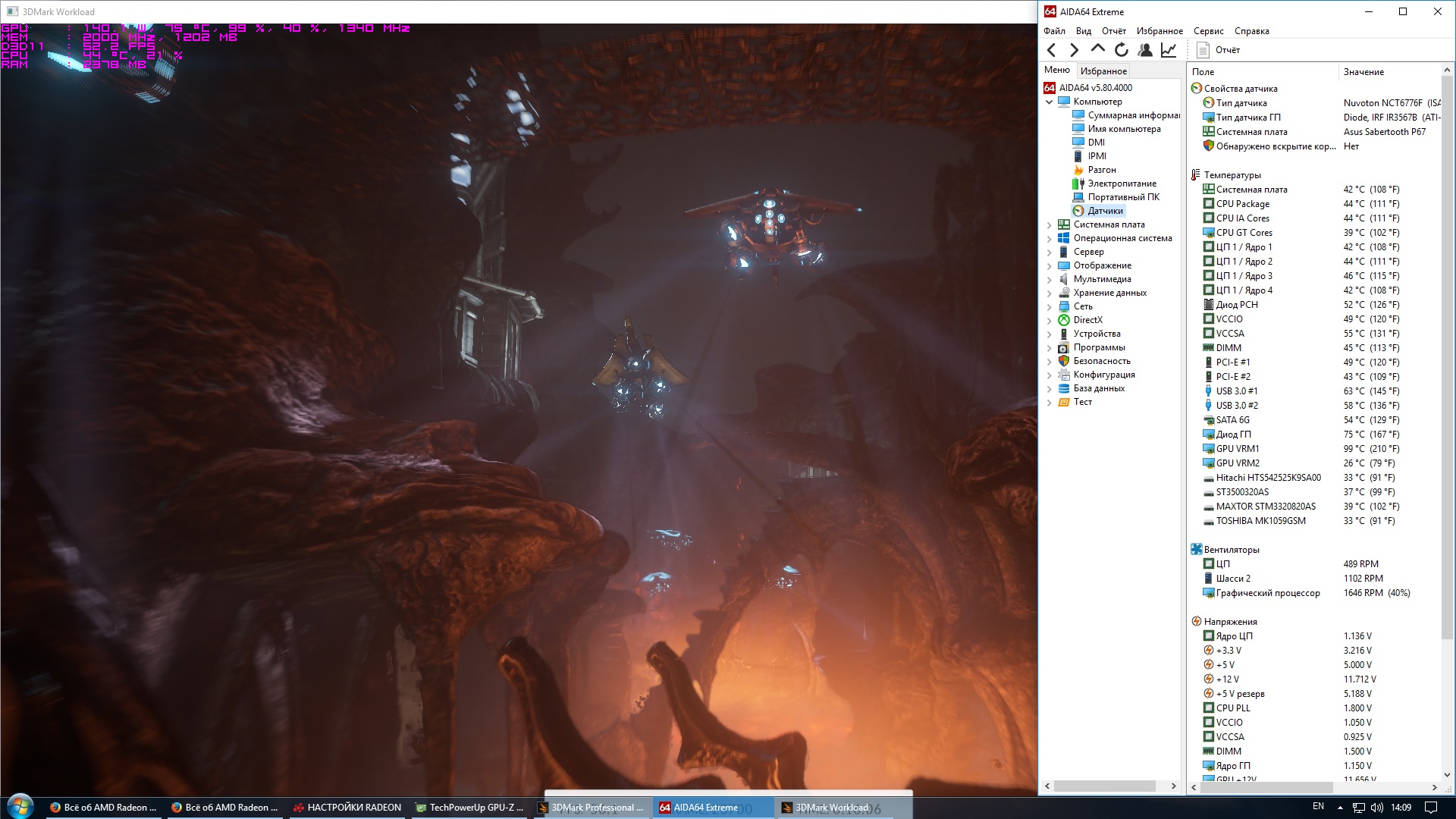 Я решил поменять корпус на более просторный. После перестановки сгорел транзистор на матплате. Пришлось мать менять. но это не суть. Опять переставил винду, поставил БП вентилем вниз. Понизил напряжение. Fulmark со сглаживанием - 76 под конец. Fire Strike - 82. БФ1 - от 66-75 в зависимости от лока ФПС. Но. Вчера заметил, что обороты вентиляторов видеокарты не разгоняются до целевых. максимум 1300 крутят при 75 градусах. Хотя в ваттмане стоит целевая 70 и 2500 обороты. Буду сегодня вечером разбираться.