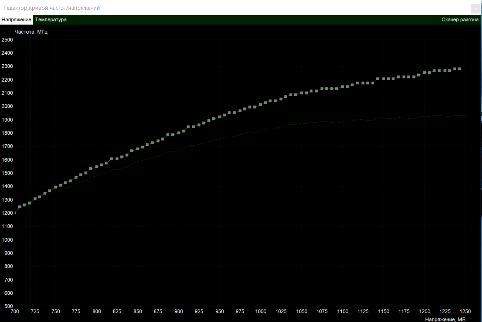 Kyle Reeze Я тоже раньше долго упорствовал (ещё на паскалях) а править тьюринги также просто как и паскали, выбираете точку напр-я в 1в к примеру и дёргаете вверх для начала к примеру на +75 держа в уме что после прогрева частота скинется на пару шагов и будет допустим не 2100, а 2070, тестите, затем пробуете ещё прибавлять ища предел стабильности, ну а ещё лучше гнать уже на горячую, когда карта прогрета. Очевидный плюс при разгоне кривой (при более-менее вменяемом чипе) - это большая производительность при меньшем напряжении и соответственно куда меньшем нагреве, что даёт возможность ещё погнать до упора в лимиты ну и частота стоит как вкопанная а не дёргается как при разгоне ползунками. Вот гайд по разгону курвой что мне Миша-hungrybot кидал: https://overclockers.ru/blog/d1my4/show ... dervolting