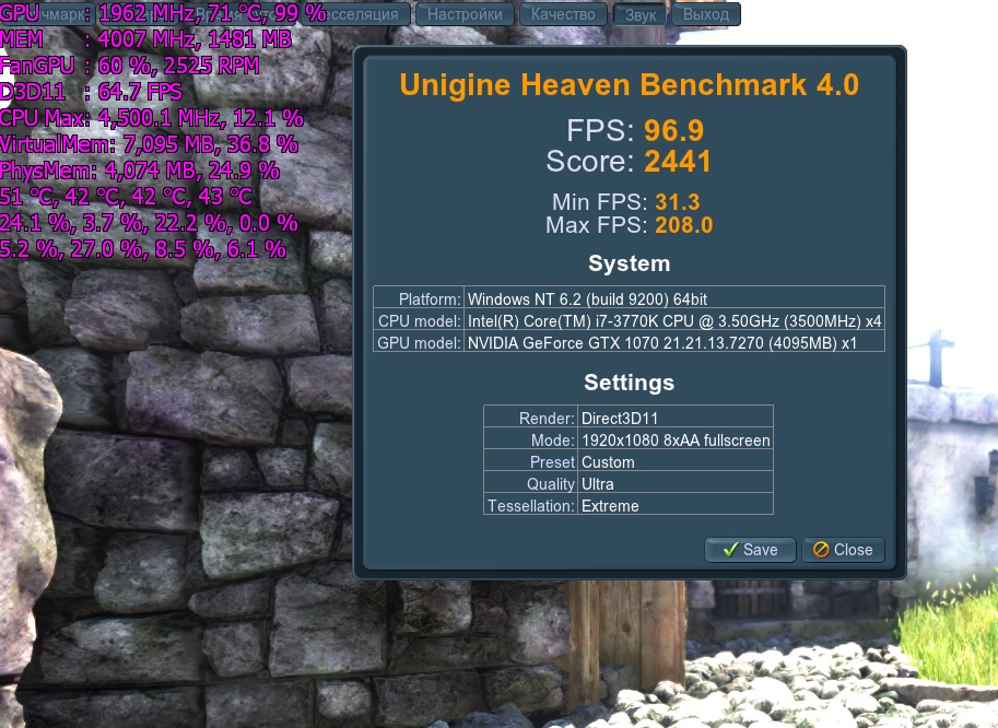 K2K минималка проявляет себя только между сменами сцен, ни в одном месте теста таких низких fps нет, влияет скорее макс. фпс (в т.ч. долговременный) в самых лёгких для видеокарты моментах, когда её загрузка даже падает ниже 99% и итоговый средний соответственно поэтому то, что 1070 на современном сокете с процем в сильном разгоне vs 1080 на старом сокете может быть быстрее в целом неудивительно - т.к. ни 1070 ни 1080 там делать вообщем то нечего особо в 1080p разрешении, скучают карточки и тест хочет CPU, всё как в старых марках Heaven пока что тяжелее либо просто лучше оптимизирован, поэтому в нём результат от CPU даже в 1080p пока что не зависит