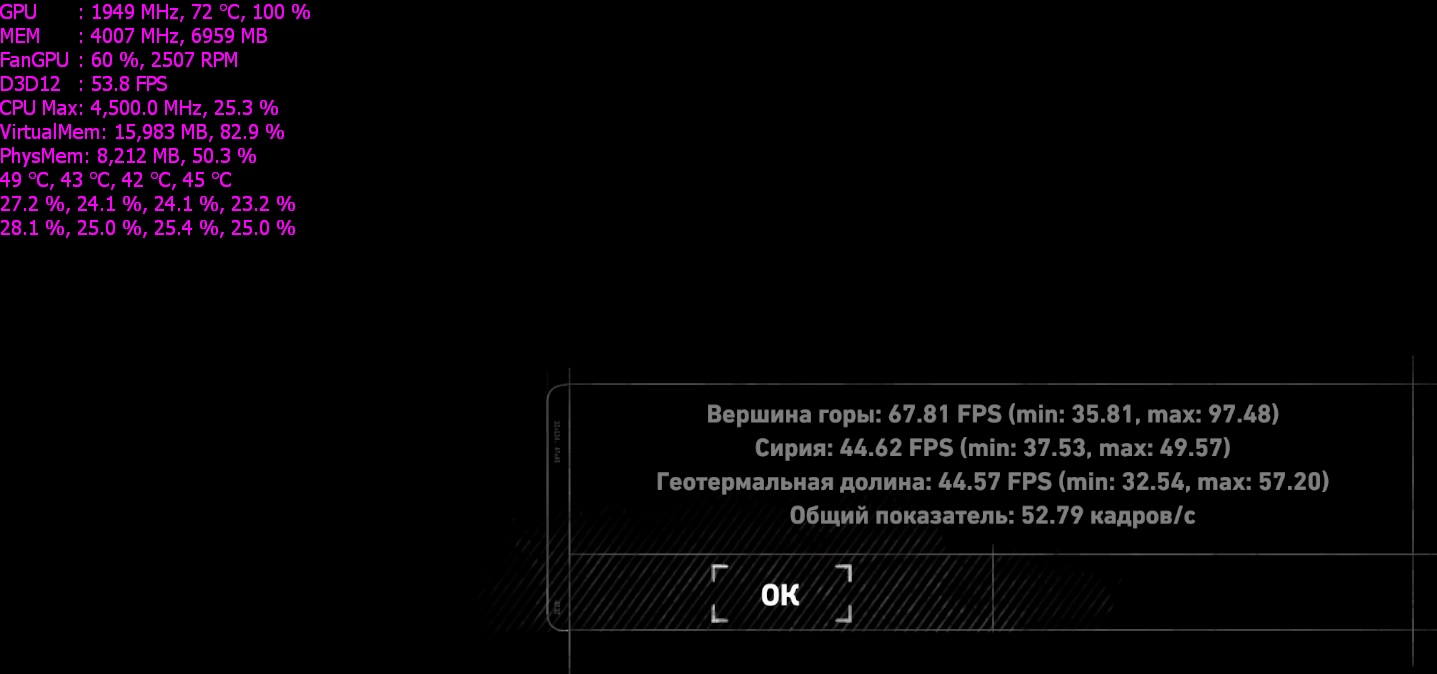 Я почему с тобой согласен за сильное влияние проца при 1080p в Valley, потому как не вижу других причин, по которым я с меньшими частотами на 1070 набил больше, чем у тебя на 1080. Вот мой давний результат, проц 4.6ггц - https://forums.overclockers.ru/download ... &mode=view