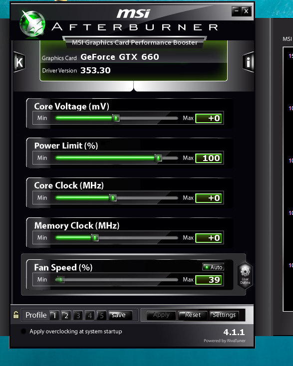 Gigabyte GV-N660WF2-2GD (rev. 2.0) практически нет прироста fps +1-2 при разгоне! разгонял через MSI Afterburner повышения на фото! может что не так делаю? выше ставишь чем память на 289 ядро на 54 просто комп вырубаться начинает, а температура нормальная 63-65 максимум! пробывал на игре ведьмак 3 и Crysis 3 так и в бенчмарках фулмарке и MSI Kombustor 3 проц Phenom II X4 Black Edition 965, разогнан сток 3400 мг разгон 3800мг больше не гониться ! это сток вот стоковые частоты! что 2-3фпс это максимум что можно выжать из видюхи? Версия DirectX: 12.0 Графический процессор: GeForce GTX 660 Версия драйвера: 353.30 Версия API Direct3D: 12 Уровень возможностей Direct3D: 11_0 Ядра CUDA: 960 Тактовая частота ядра: 980 МГц Скорость передачи данных памяти: 6578 МГц Интерфейс памяти: 192 бит Пропускная способность памяти: 157.87 ГБ/с Доступная графическая память: 6143 МБ Выделенная видеопамять: 2048 МБ GDDR5 Системная видеопамять: 0 МБ Разделяемая системная память: 4095 МБ Версия BIOS видео: 80.06.58.00.97 IRQ: Not used Шина: PCI Express x16 Gen2 Идентификатор устройства: 10DE 11C0 36251458 Номер комплекта: 2030 0000