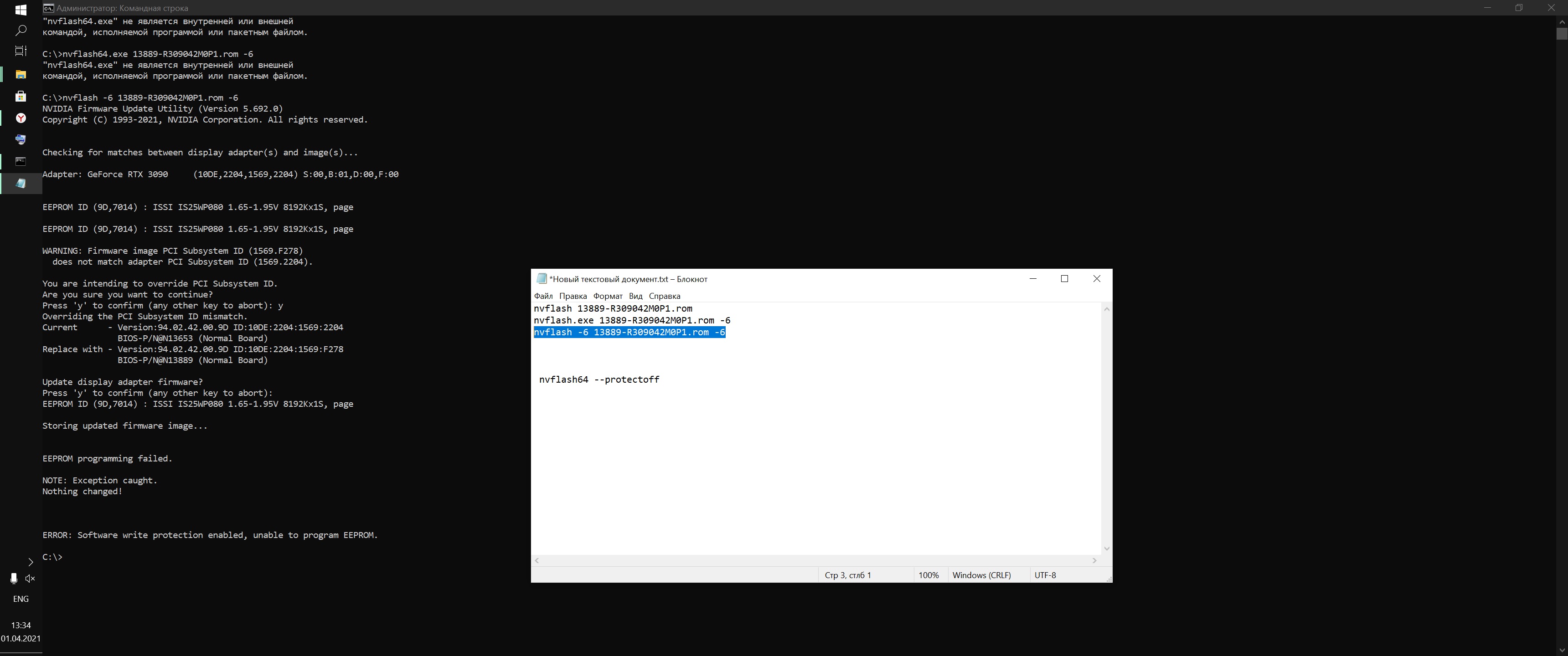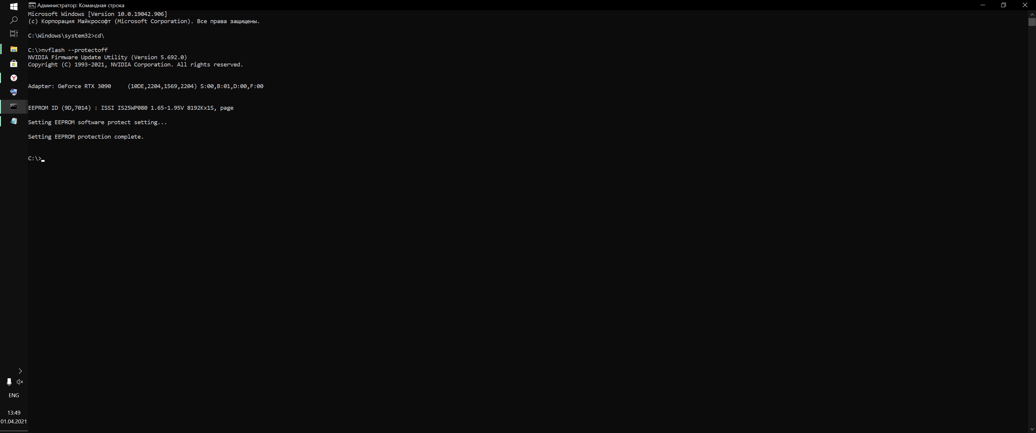 Всё на ц, есть и папка nvflash, в ней файл одноимённый из папки 64, есть и просто файл nvflash в корне ц, естественно биос тоже в корне ц. Поступила информация следующего содержания - Спасибо за скриншоты, по информации на скриншоте включена защита BIOS, что, конечно, довольно странно, или видеокарта используется драйвером или сторонними программами, попробуйте следующее: 1. Используйте команду nvflash.exe --protectoff перед прошивкой BIOS. 2. Выключите видеокарту в диспетчере устройств с последующей перезагрузкой и повторите прошивку. 3. Выключите сетевое соединение, удалите драйверы видеокарты в Display Driver Uninstaller: http://www.guru3d.com/files-details/dis ... nload.html и повторите прошивку с последующим включением сетевого соединения и с установкой драйверов с https://www.nvidia.ru/Download/index.aspx?lang=ru .