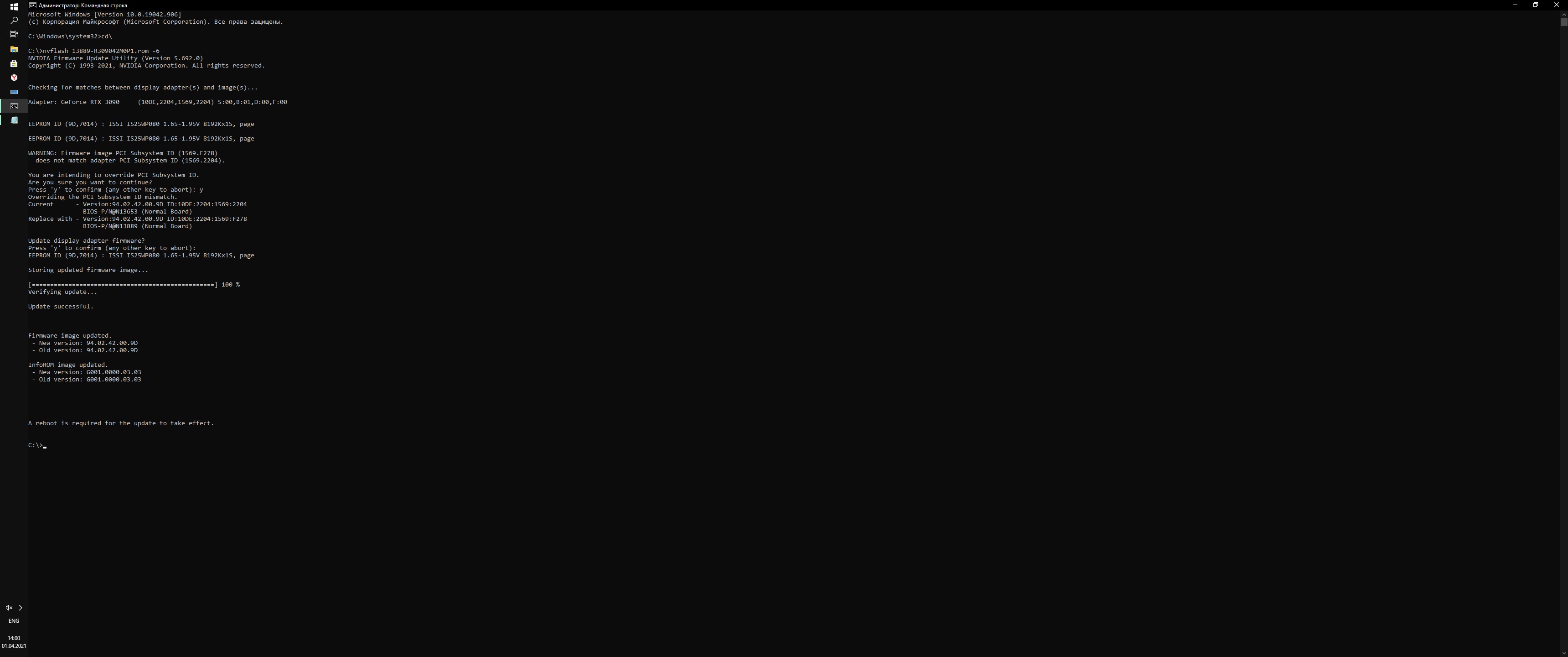 Как у меня получилось прошить: 1. Карта на ЛОУ биосе, вкл комп, запустил прогу, шьюсь, автоперегруз, проверяю версию - НИЧЕГО 2. Перегружаю комп руками, запускаю прогу, шьюсь, автоперегруз, проверяю версию - все прошилось, 94.02.42.00.BB от 2021-03-10 3. Комп выкл 3. Карта на ХАЙ биосе, вкл комп, загружаюсь в винду, перегружаюсь руками, запускаю прогу, шьюсь, автоперегруз, проверяю версию - все прошилось, 94.02.42.00.BB от 2021-03-10