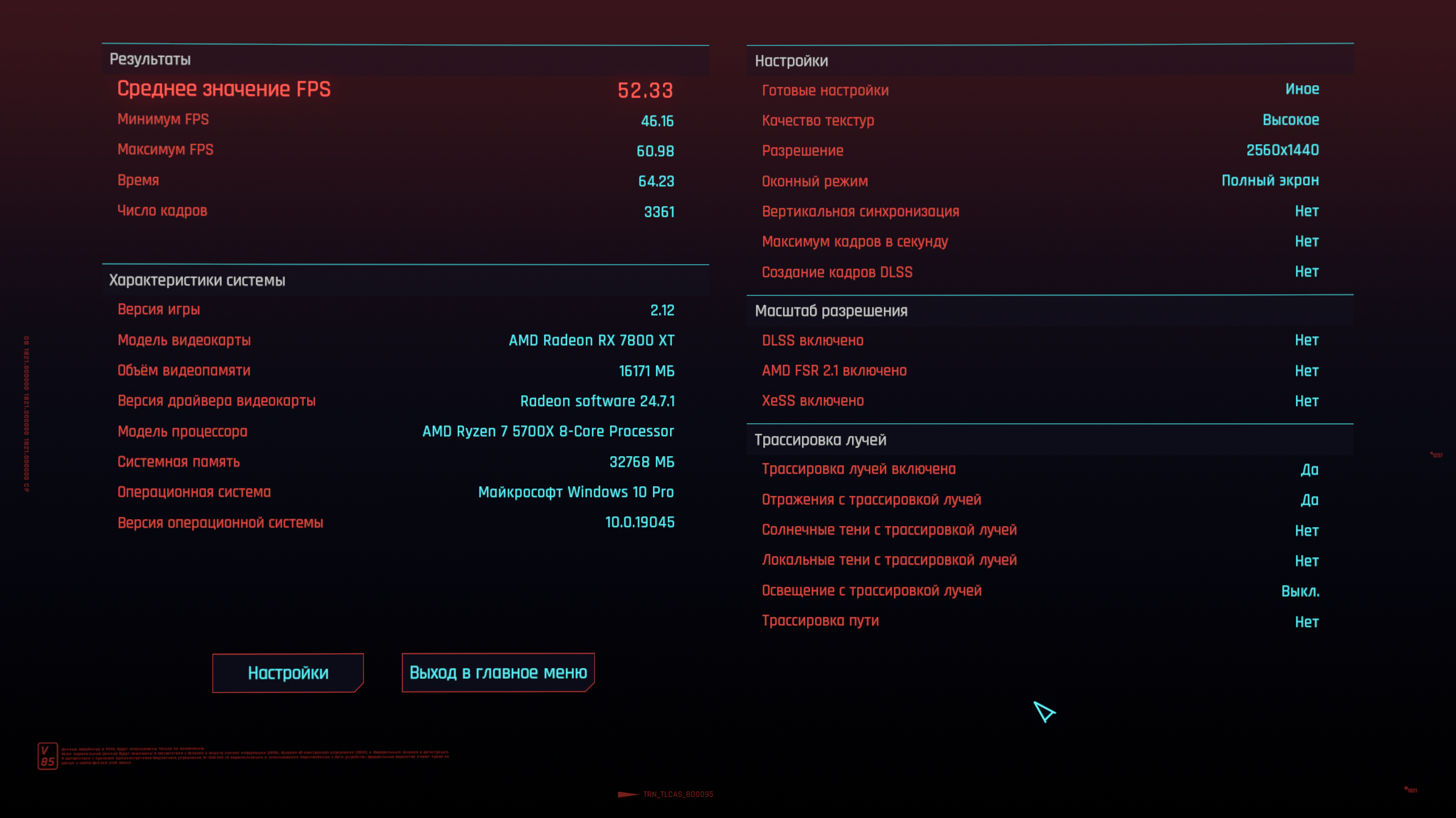 IMVEKO-SPQR- А если несложно, прогоните пожалуйста в FHD, а то я за неимением 1440р монитора включил VSR в настройках амд, в игре выставил 1440p и офигел: сред\мин\макс=72\63\95. Неужели VSR настолько сильно съедает производительность, или у меня лыжи не едут на профильной системе? В FHD на таких же настройках, как у IMVEKO выше получаю 117\101\150.