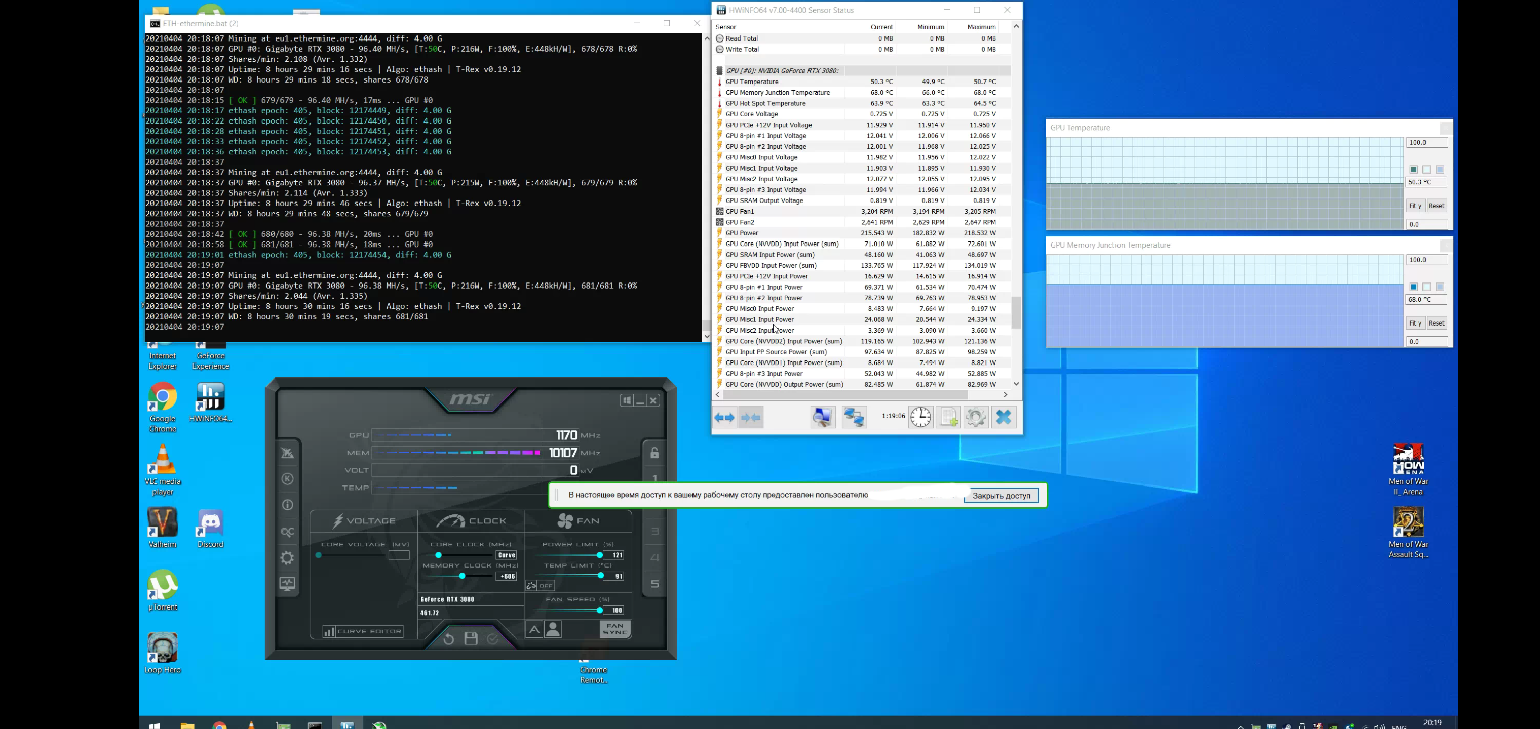 Perelom4eshui hwinfo с окном майнера, минимум 30 минут майна. и статистика среднего хешрейта по майнеру за это время. я тоже могу 55гр сделать, но это будет не 21000 память и 101мхеш