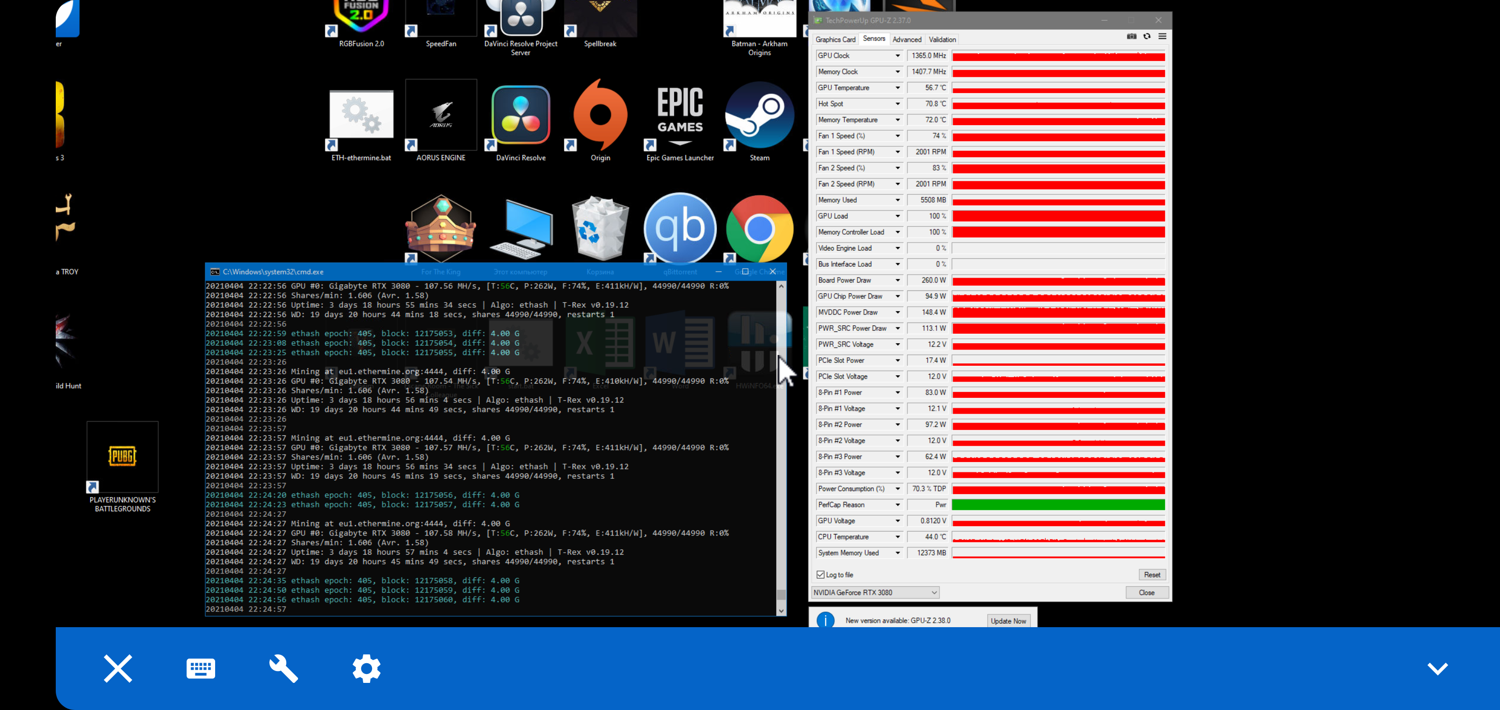 Вот скриншот самого майнера, аптайм 19 дней. Сейчас память 11250 по афтербёрну , больше толку нет особо, хэши не растут.
