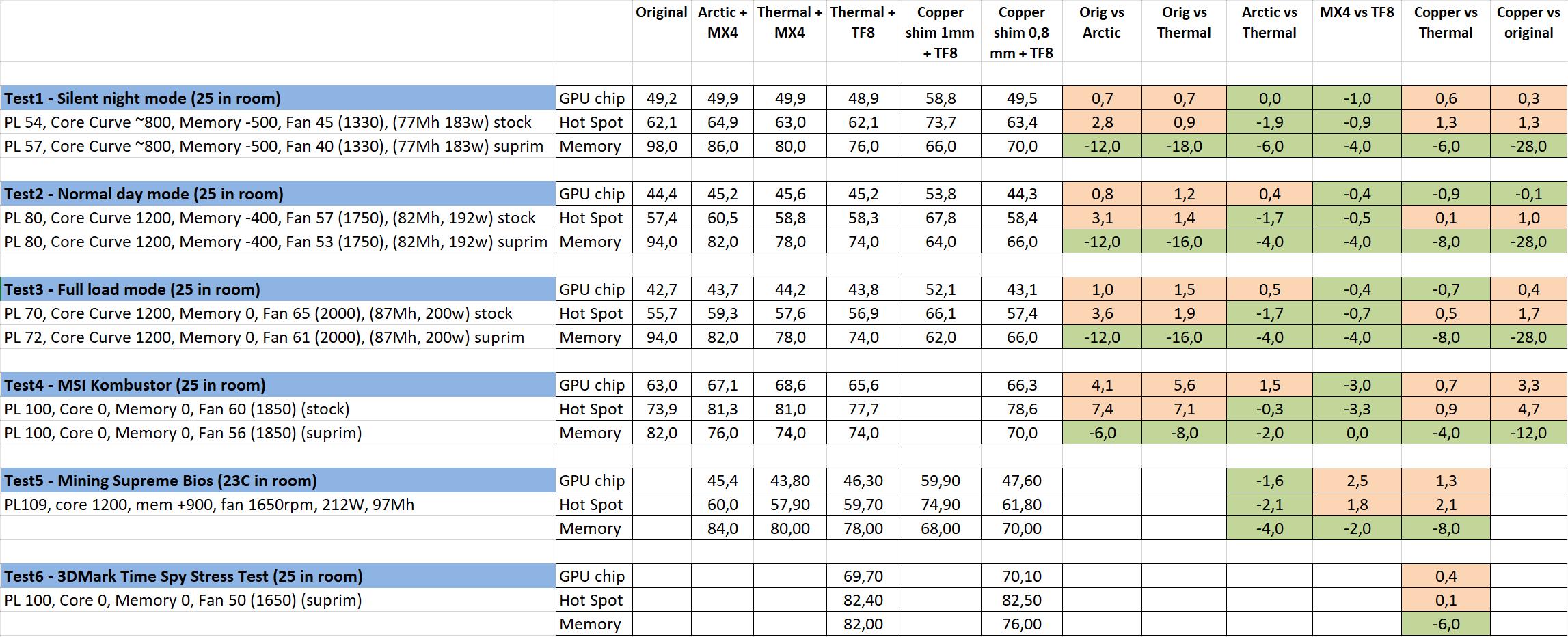 Как оказалось, толщины 1мм пластины избыточно много и прижима на ГПУ недостаточно, из-за чего поимел высокие температуры на ГПУ. Далее провел эксперимент с 0.8мм пластинами, результаты сведены в таблице ниже: от термопрокладок Thermalright -6-8C, от стока -28С. Кому нужны детали, прошу посмотреть видео.