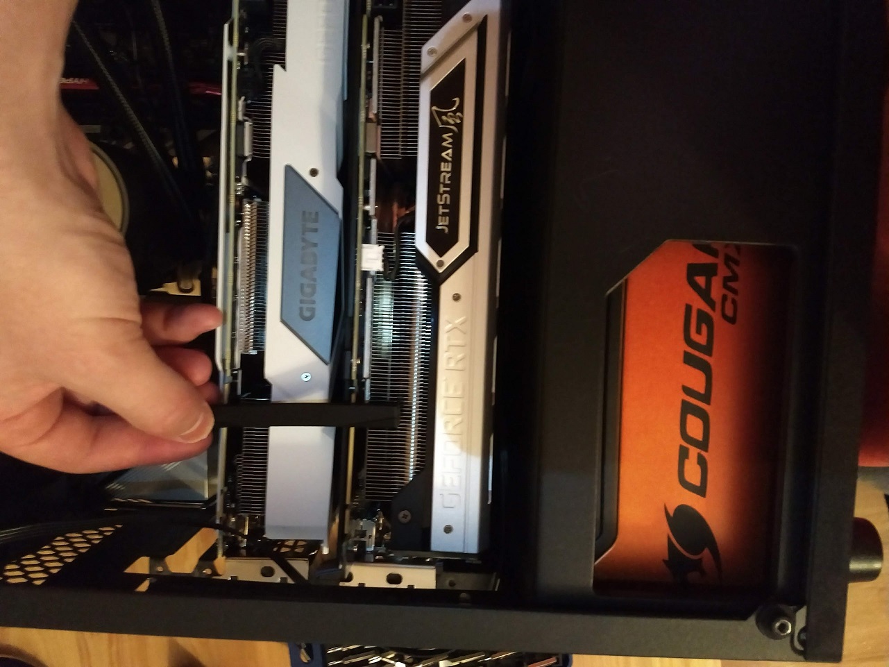 Пришла моя скидочная вторая 2070S. но как я и ожидал из-за разницы ширины печатных плат натянуть NVLink на Palit и Gigabyte ну никак. Попытка насовхозить нужный сантиметр через райзер в моем корпусе тоже провалилась. На фото немножко виден какой угол между контактами получается. При этом я да, сравнил Jetstream и Gigabyte gaming OC по шуму и температурам. Все не в пользу Гигабайта (+3-4 градуса, шум мб и одинаковый по децибелам но какой-то более противный высокочастотный у Гиги). Palit - вы молодцы, у вас топчик за эти деньги ) Но пацан сказал - пацан сделает NVLink таки. Поэтому (надеюсь это не отнесут к барахольной теме, это чистый энтузиазм) предлагаю махнуть свой Palit Jetstream 2070 Super на чей-нибудь Gigabyte Gaming OC 2070 Super.
