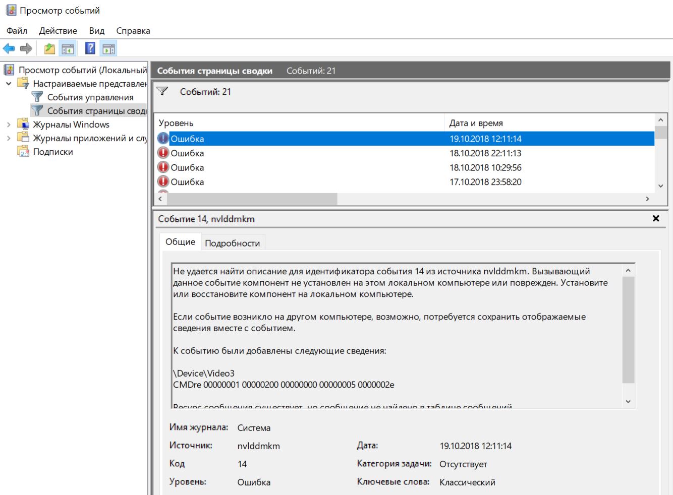 Не удается найти описание для идентификатора события 14 из источника nvlddmkm. Вызывающий данное событие компонент не установлен на этом локальном компьютере или поврежден. Установите или восстановите компонент на локальном компьютере. Если событие возникло на другом компьютере, возможно, потребуется сохранить отображаемые сведения вместе с событием. К событию были добавлены следующие сведения: \Device\Video3 CMDre 00000001 00000200 00000000 00000005 0000002e Ресурс сообщения существует, но сообщение не найдено в таблице сообщений