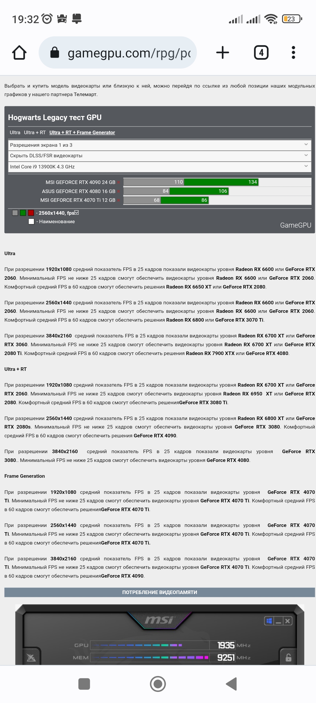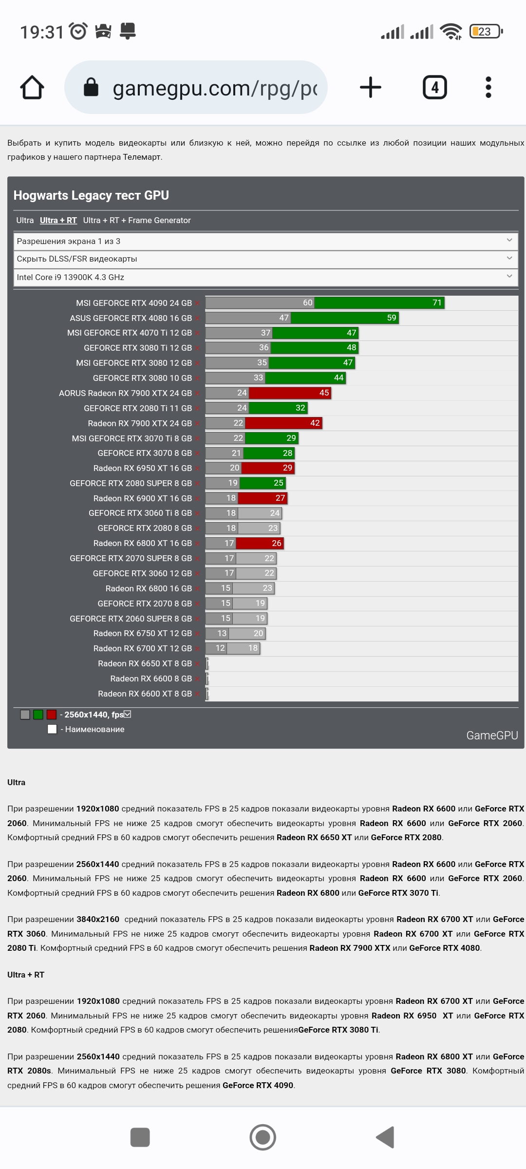 Любую игру в 1440п ест вообще без каких либо компромиссов. 100-130фпс абсолютно везде со всеми ползунками вправо в 1440р. Киберпанк на макс лучах с длсс3 выдает 120фпс (вообще шок от картинки и кадров).