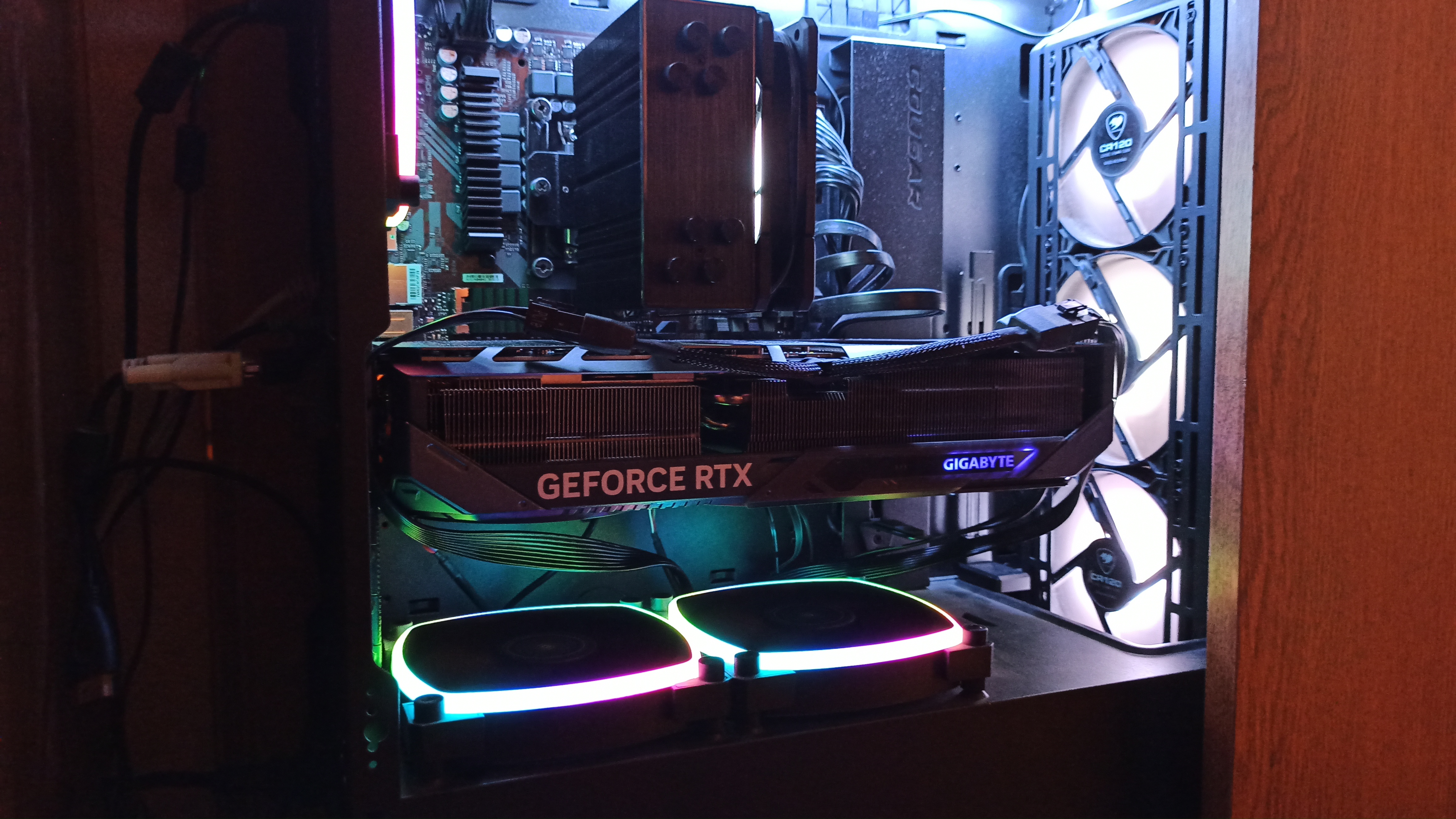 В Когуаре Дуалфейс Про РГБ, хоть и нет стеллажа для дисков, но, обратите внимание на штатную подпорку видеокарты Гигабайт 5070 Ти гейминг ос Чуть-чуть в "дырку" не провалилась Стоит на краю бездны весьма надежно!