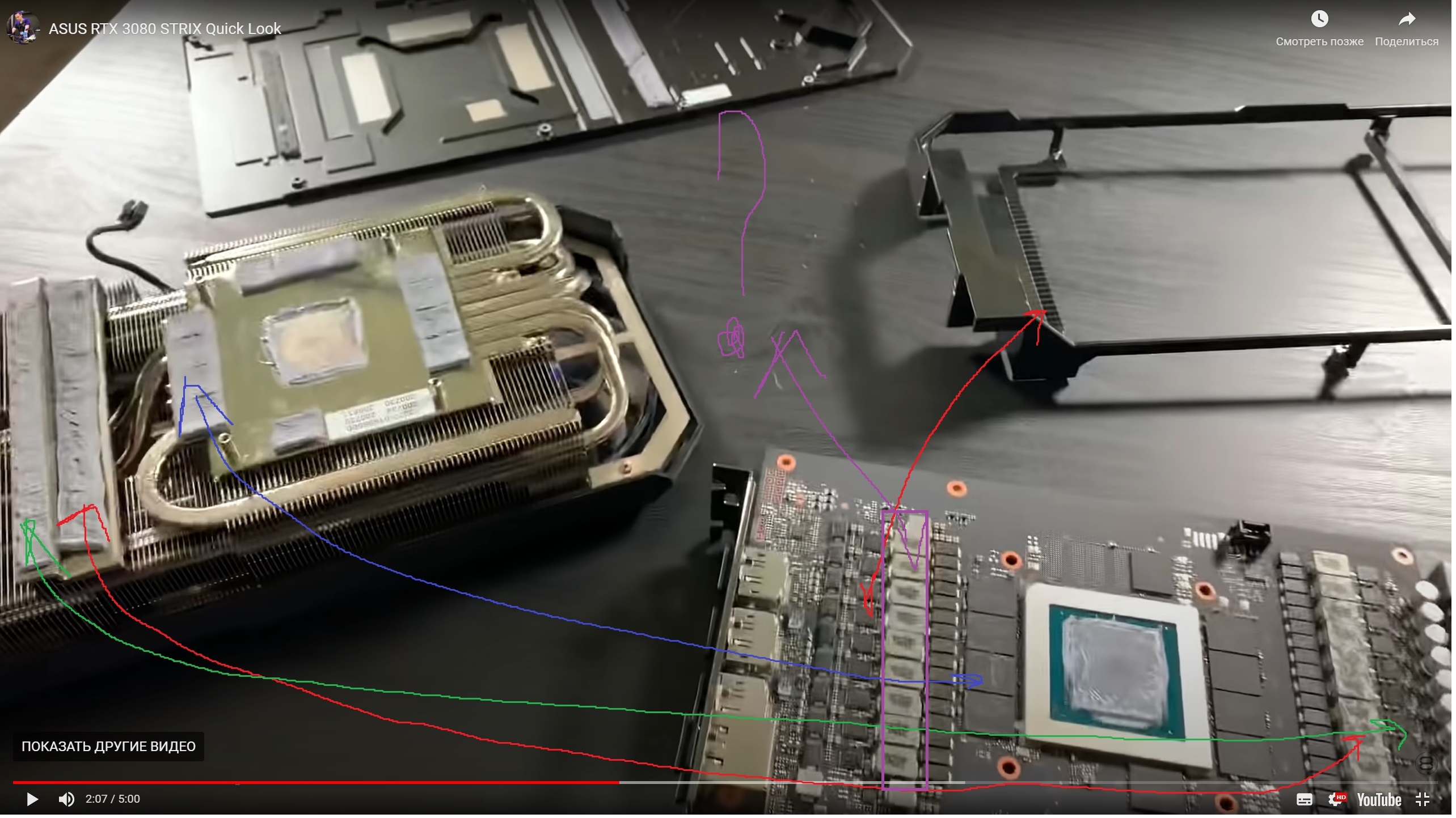 Дроссели что выделил фиолетовым на скрине. Вроде как справа охлаждаются, а слева не нужно охлаждать? На всех картах других вендоров они охлаждаются, если их не нужно охлаждать, зачем тогда другие вендоры их накрывают? Да, увидел в hw info температуру vrm там все отлично, но почему не сделали что бы каркасом прочности например были накрыты эти дроссели?