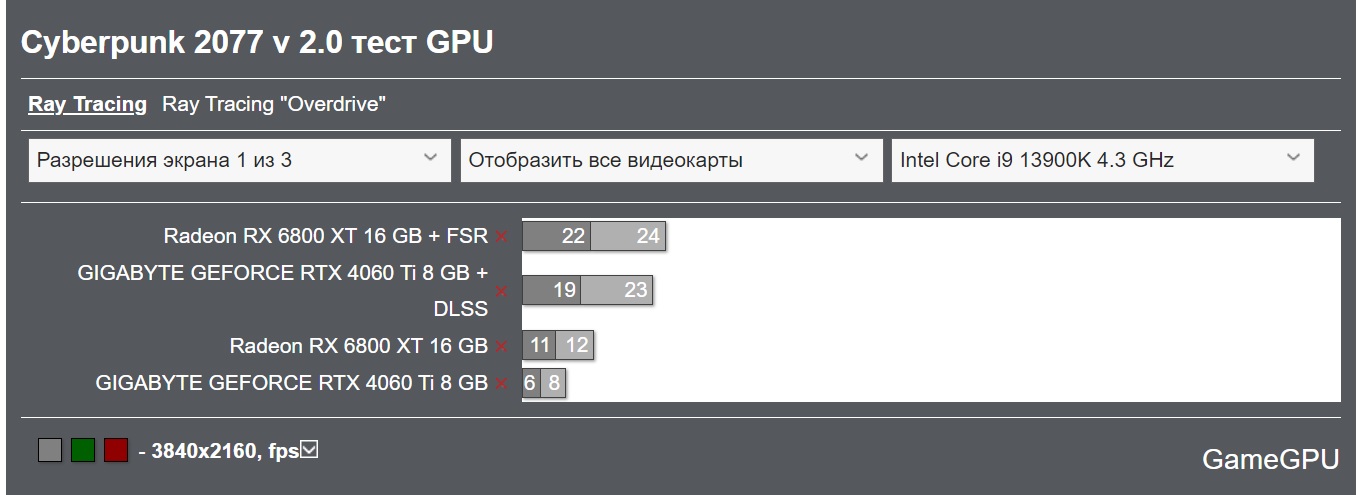 или ты отбросили игры где моя карта делает 4070 и будем учитывать только самые неудачные? ну тогда в киберпанк возьми в 4к показатель, там 4060ти хуже с лучами, да фпс неиграбельный