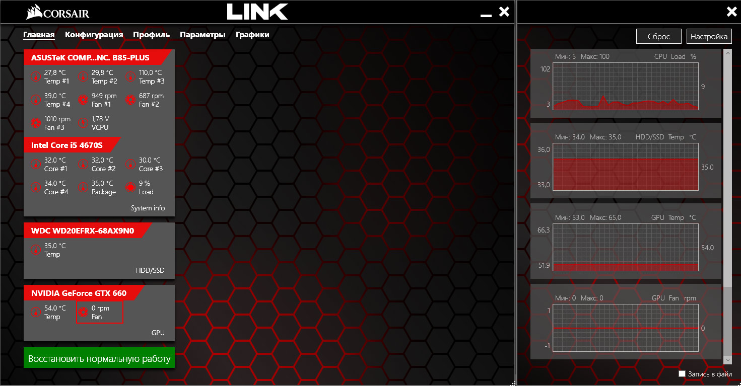 Здравствуйте, форумчане. Проблема с карточкой Palit GF 660, которой около 3-х лет. Перестал нормально работать вентилятор. Во время включения компа работает 1-2 секунды, затем отключается. Поставил afterburner, он пишет, что кулер крутится, чего по факту нет. При переводе в ручной режим и выставлении оборотов на максимум через какое-то время вдруг он может самопроизвольно включиться (может через час, может через два, а может и вообще не включиться). Если включился, то работает как надо, можно перейти опять в автоматический режим управления кулером. С самим вентиляторов проблем нет, давал его другу, он прекрасно работает. Вероятно, что с контроллером управления. Ситуация одинакова как на новых актуальных дровах, так и на старых после отката. В программе Link Corsair при простое кулера скорость действительно пишет, что 0 (в отличие от afterburner). Прошу совета, в чем может быть дело. Скрины прилагаю.