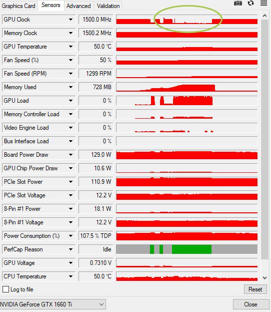 Хмммм, очень странно. Я сейчас заметил, что при запуске игры, частота ГП падает со стандартных 1500 до 950, так наверное не должно быть? Вот скрин приложил, видно по графику (обвел зеленым) моменты когда запущена игра видюха частоту снижает, только вот нафига?