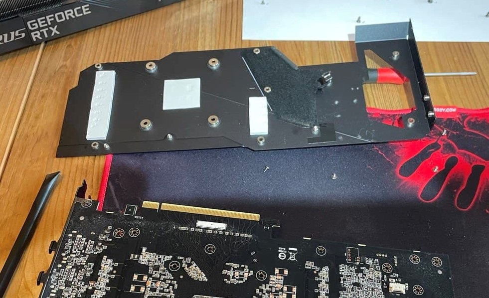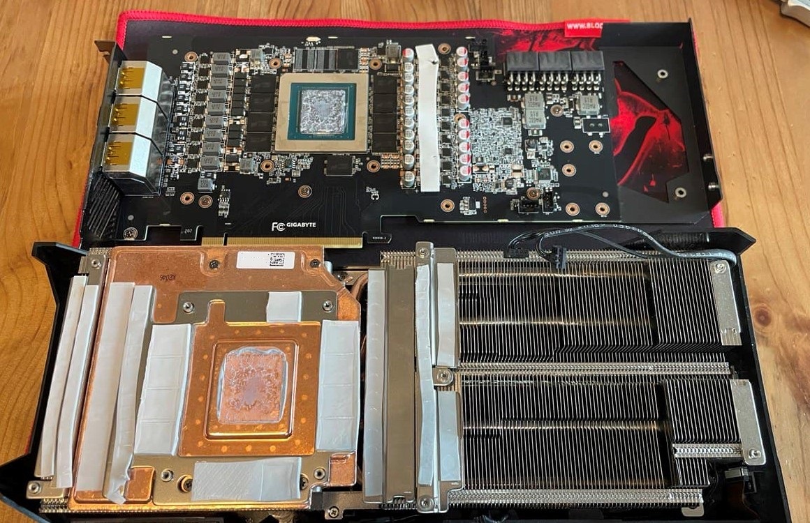 Вскрыл aorus master rev 2.0. Морда усеяна термухами. Под бэкплейт, под чипы памяти, как обычно не доложили. При этом положили под чип и конденсаторы. Странные товарищи.